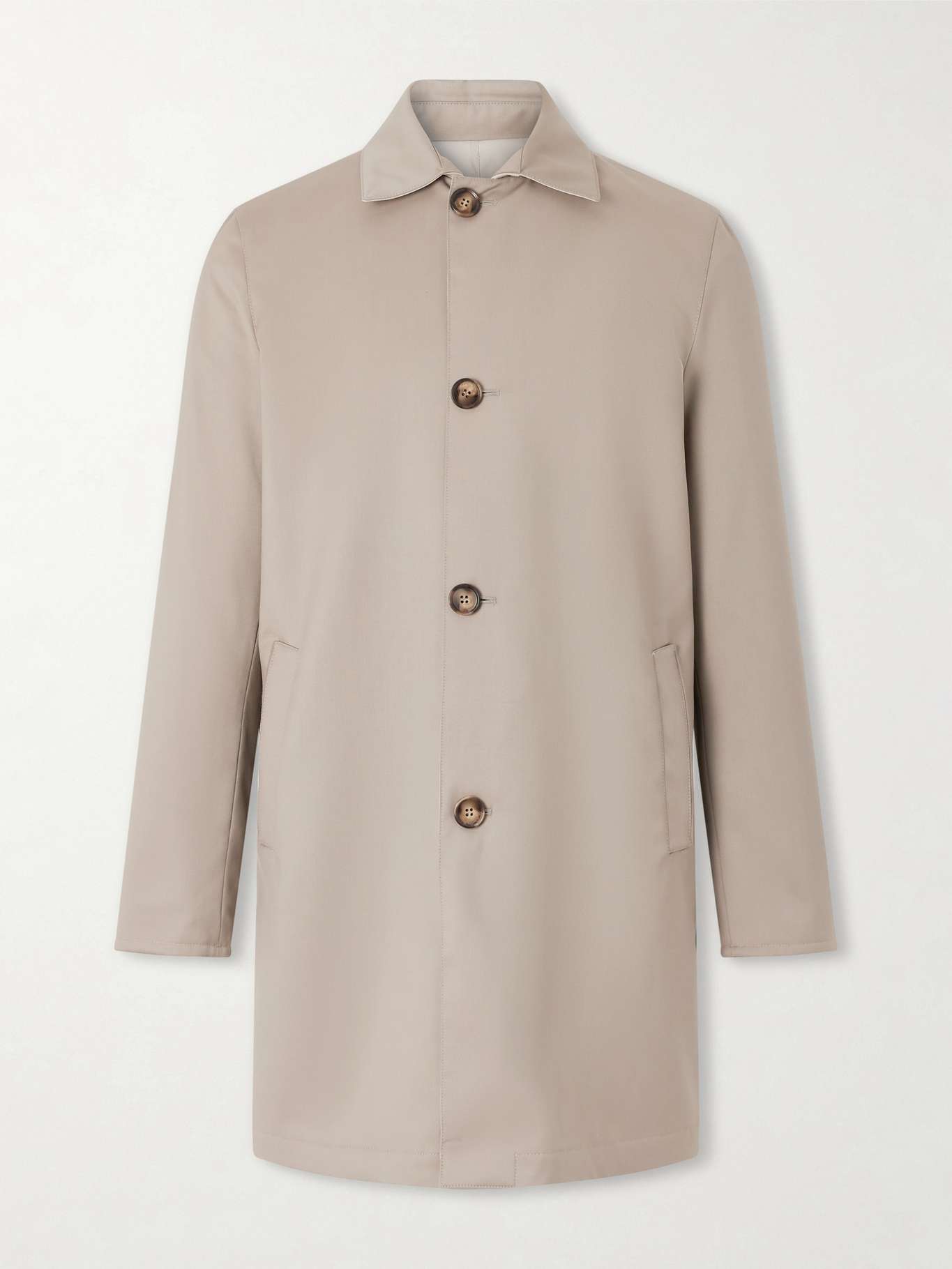 Thom Sweeney's rain mac is crafted from pure wool-twill, offering a soft, structured handle with natural warmth. Designed with a reversible construction, it allows for versatility in wear, while the clean lines keep the silhouette composed.