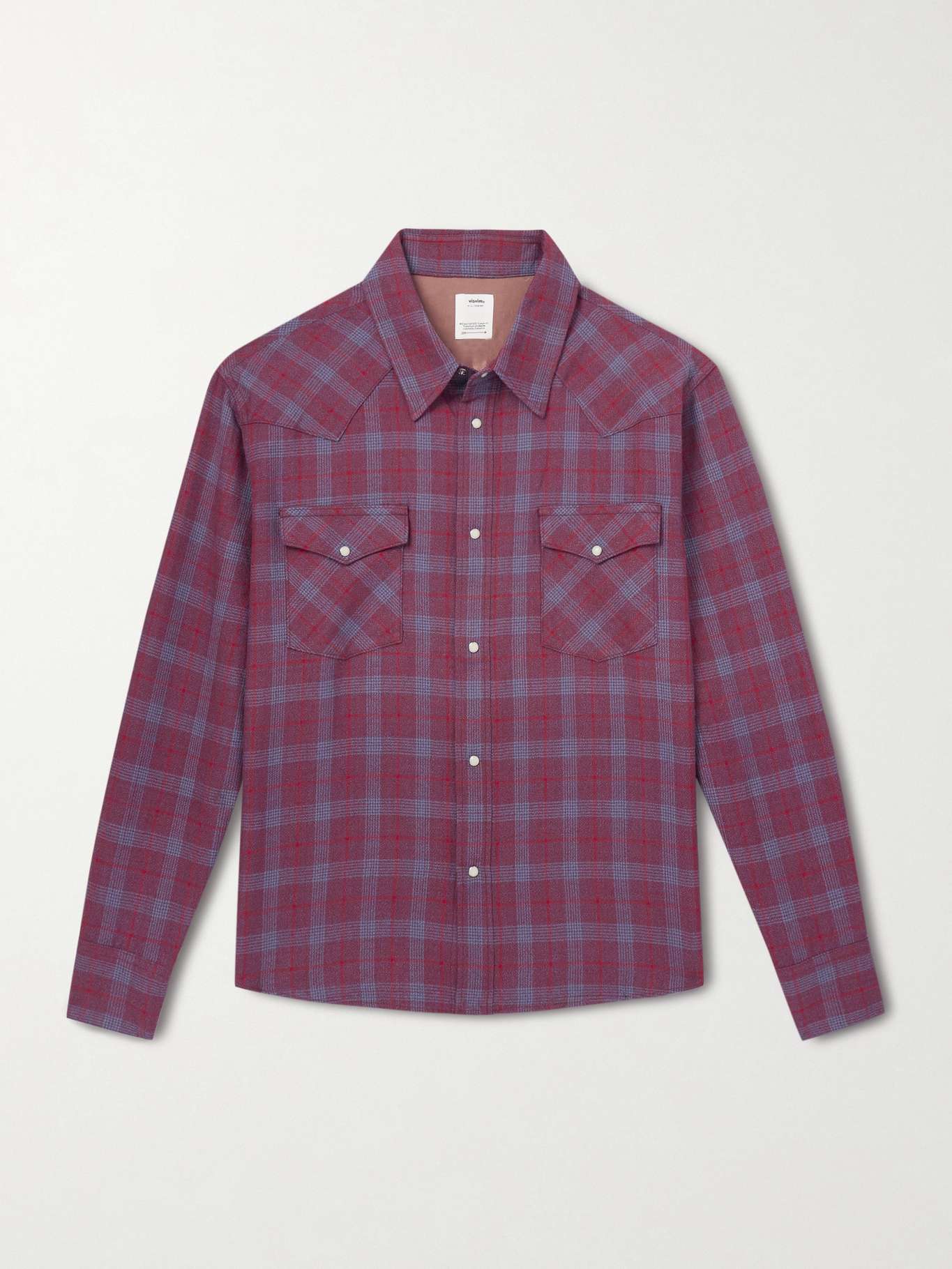 visvim's 'Four Corners' shirt is your quintessential sawtooth, with its pearlescent snaps and angled yokes. It's been made in Japan from a tactile wool and linen-blend and woven with blue and red checks that are set on the diagonal at the pockets.