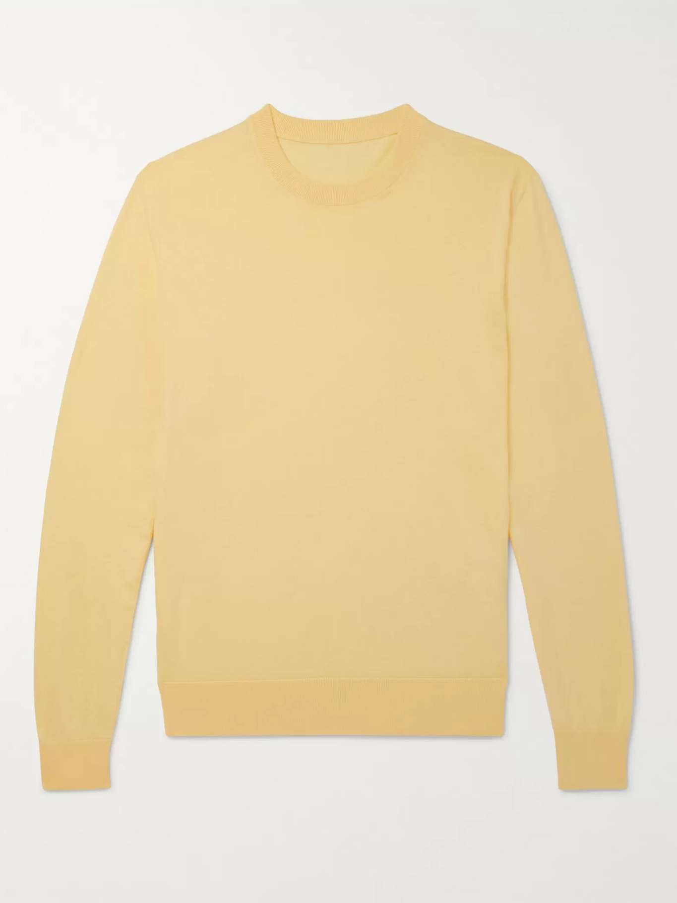 The pale-yellow shade of Anderson & Sheppard's sweater pairs equally well with light and dark colours – try teaming it with tailored white shorts or navy trousers. This lightweight knit has been made in Italy from Sea Island cotton which is prized for its soft handle, breathability and hypoallergenic qualities. Shown here with Anderson & Sheppard shorts, Brunello Cucinelli shoes, Bottega Veneta bracelet.