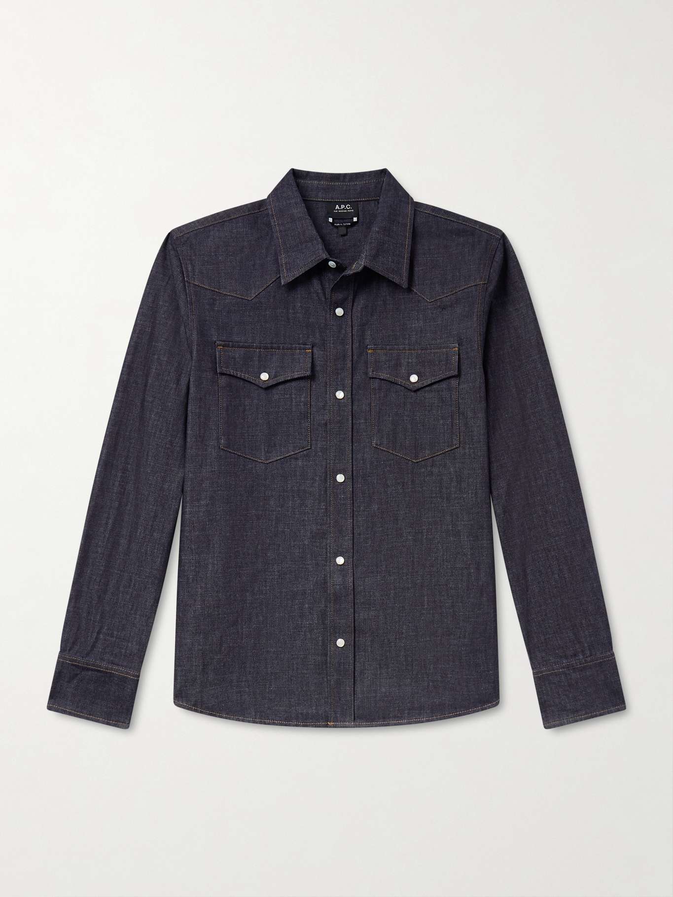 A.P.C.'s shirt has all the hallmarks of Western styles, from pearlescent snap buttons to sepia-toned topstitching. It's made from organic cotton-chambray and cut slightly loose through the body with a rounded hem and angled yoke.