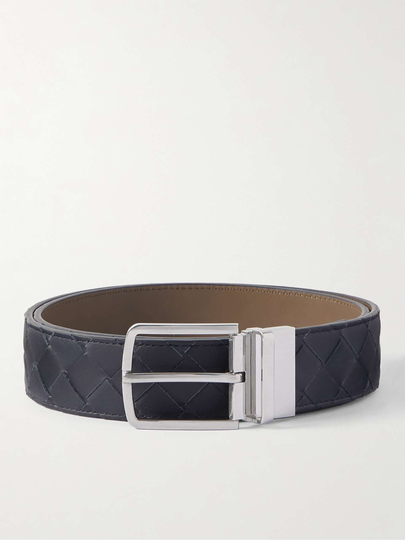 Bottega Veneta's leather belt is woven in the house's intrecciato pattern on one side - the iconic technique speaks to a quiet sense of luxury but just as importantly, it adds strength and durability to each piece. Made in Italy, it reverses between navy and camel and is finished with a silver-tone square buckle.