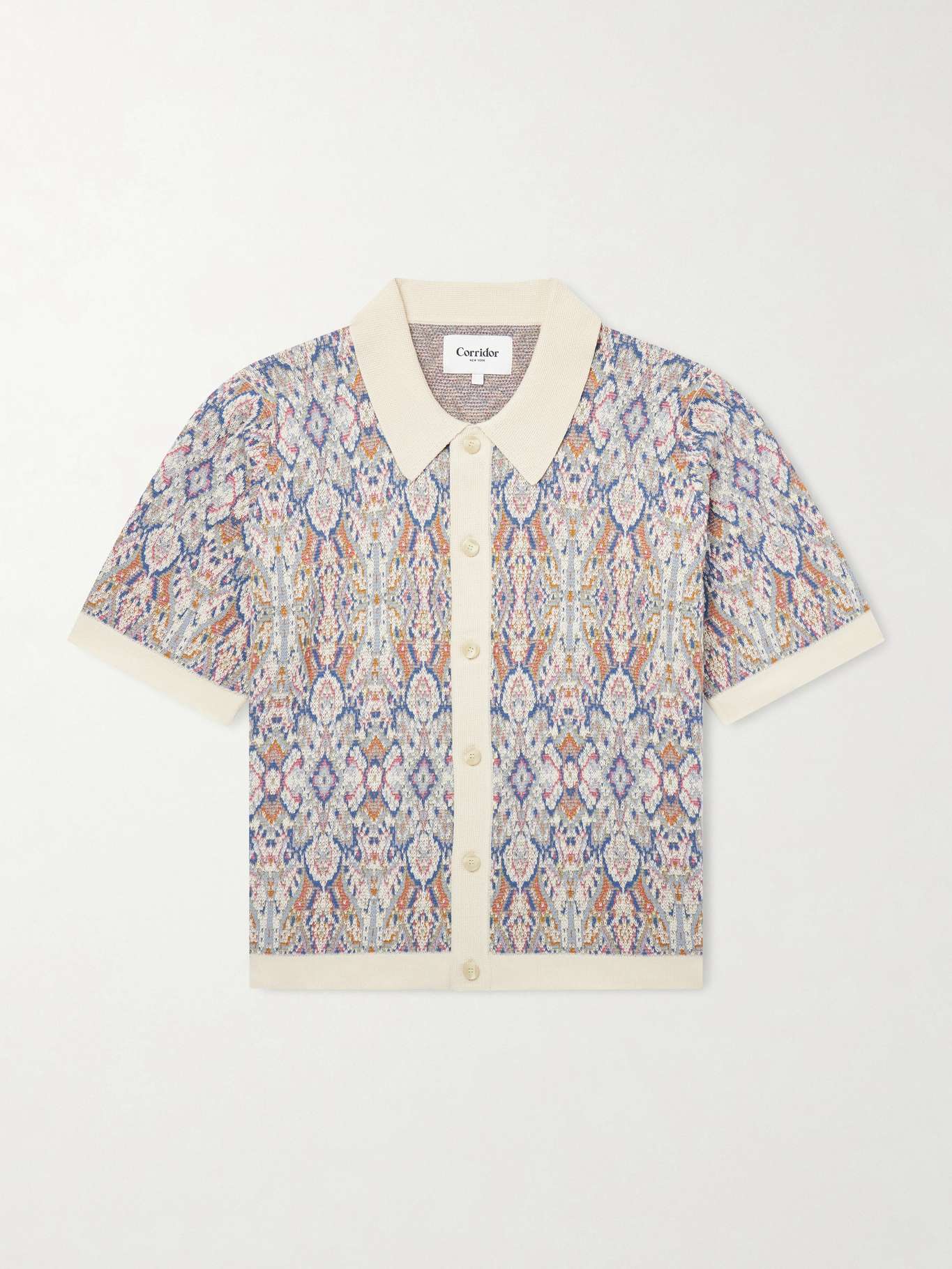 Jacquard-knitted from cotton in a tapestry-inspired all-over motif, Corridor’s shirt is cut in a regular fit with slightly loose short sleeves. Solid ribbing at the cuffs, hem and placket, along with a plain collar, frames the pattern—pair it with denim or textured trousers for an easy, balanced look.