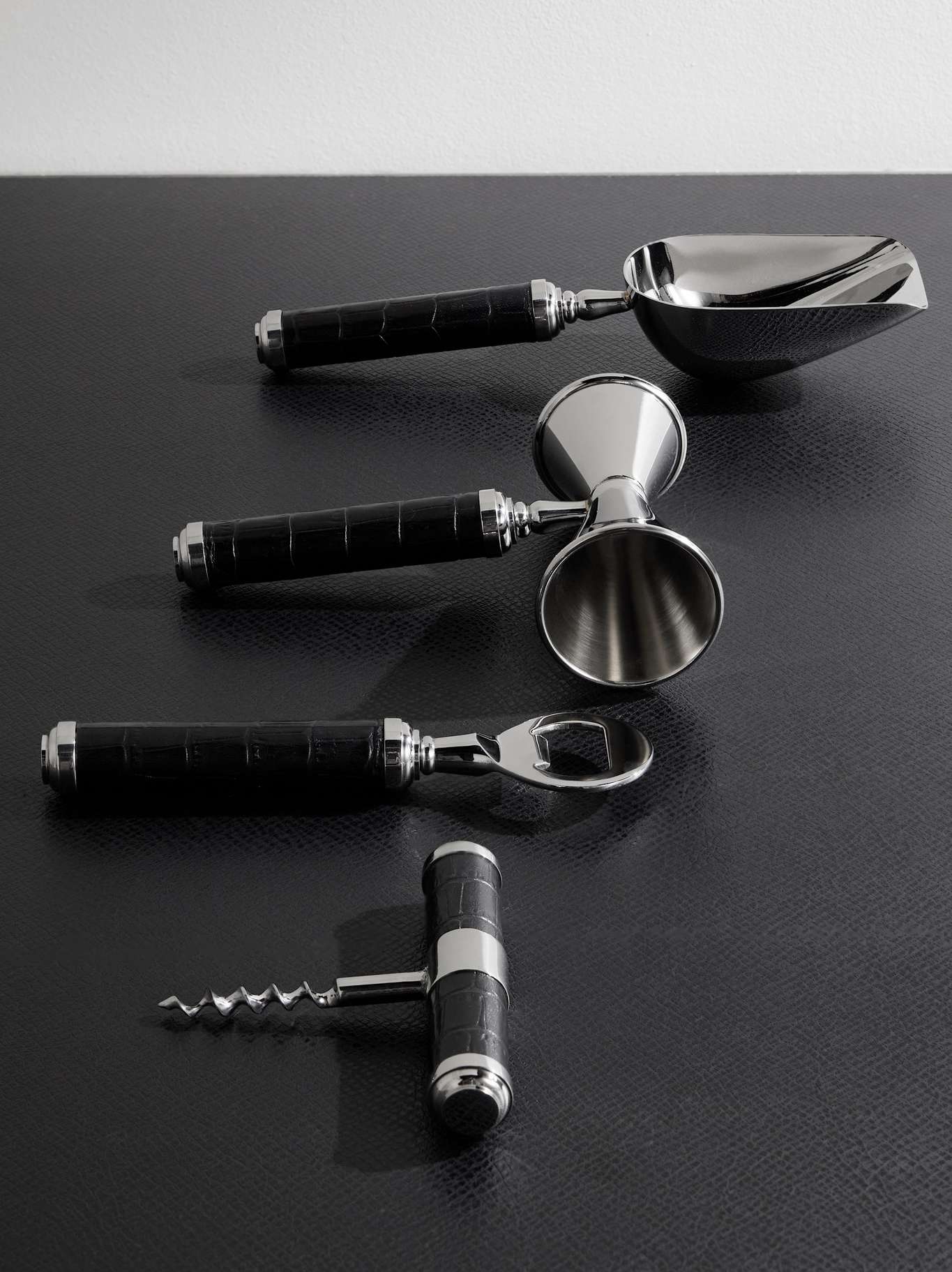 Ralph Lauren Home's 'Wells' bar set is equipped with all the tools you'll need to mix and prepare your favourite drinks, including a corkscrew, bottle opener, ice scoop and double jigger. Each piece is crafted from polished stainless steel and has a croc-effect leather handle.