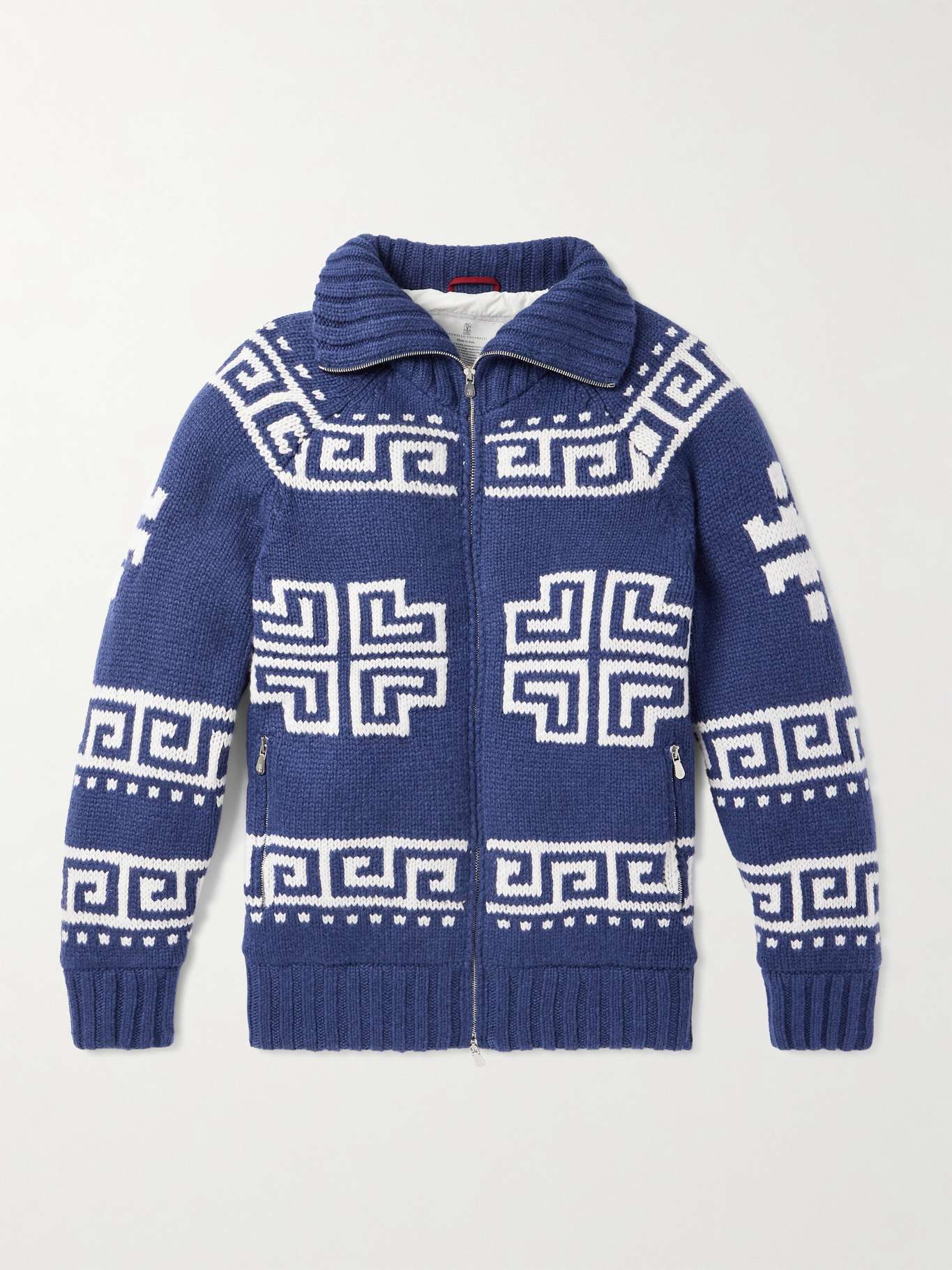 The cashmere used to make Brunello Cucinelli's cardigan is prized for its soft handle and enduring quality. It's jacquard-knitted with a geometric pattern and has a cosy funnel neckline. A layer of down padding keeps you warm.