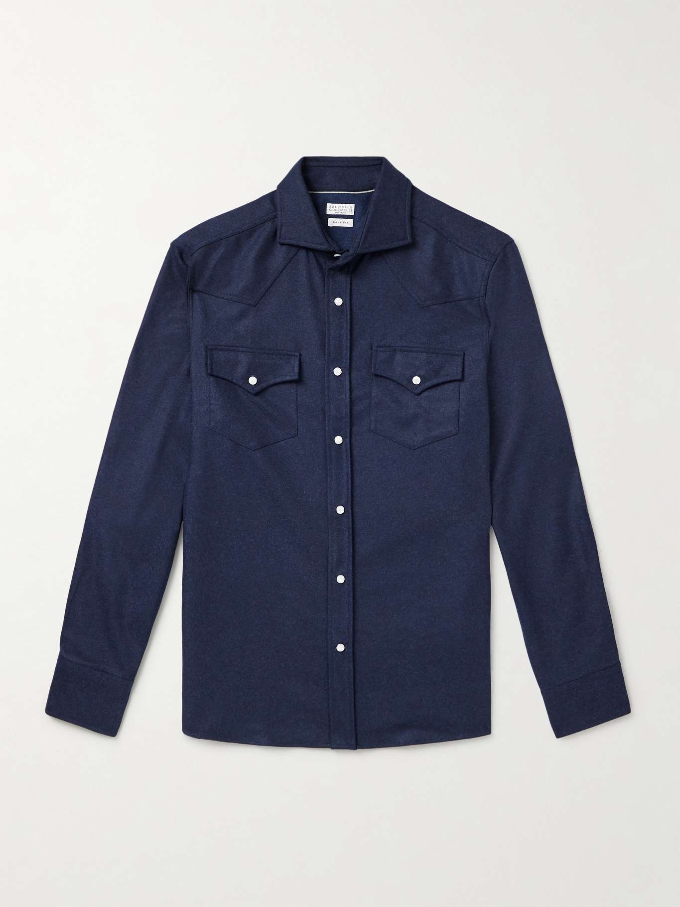 EXCLUSIVE AT MR PORTER. Brunello Cucinelli's shirt has pointed yolks and flap pockets that riff on traditional Western styles. It's been made in Solomeo, Italy, from soft virgin wool-flannel.