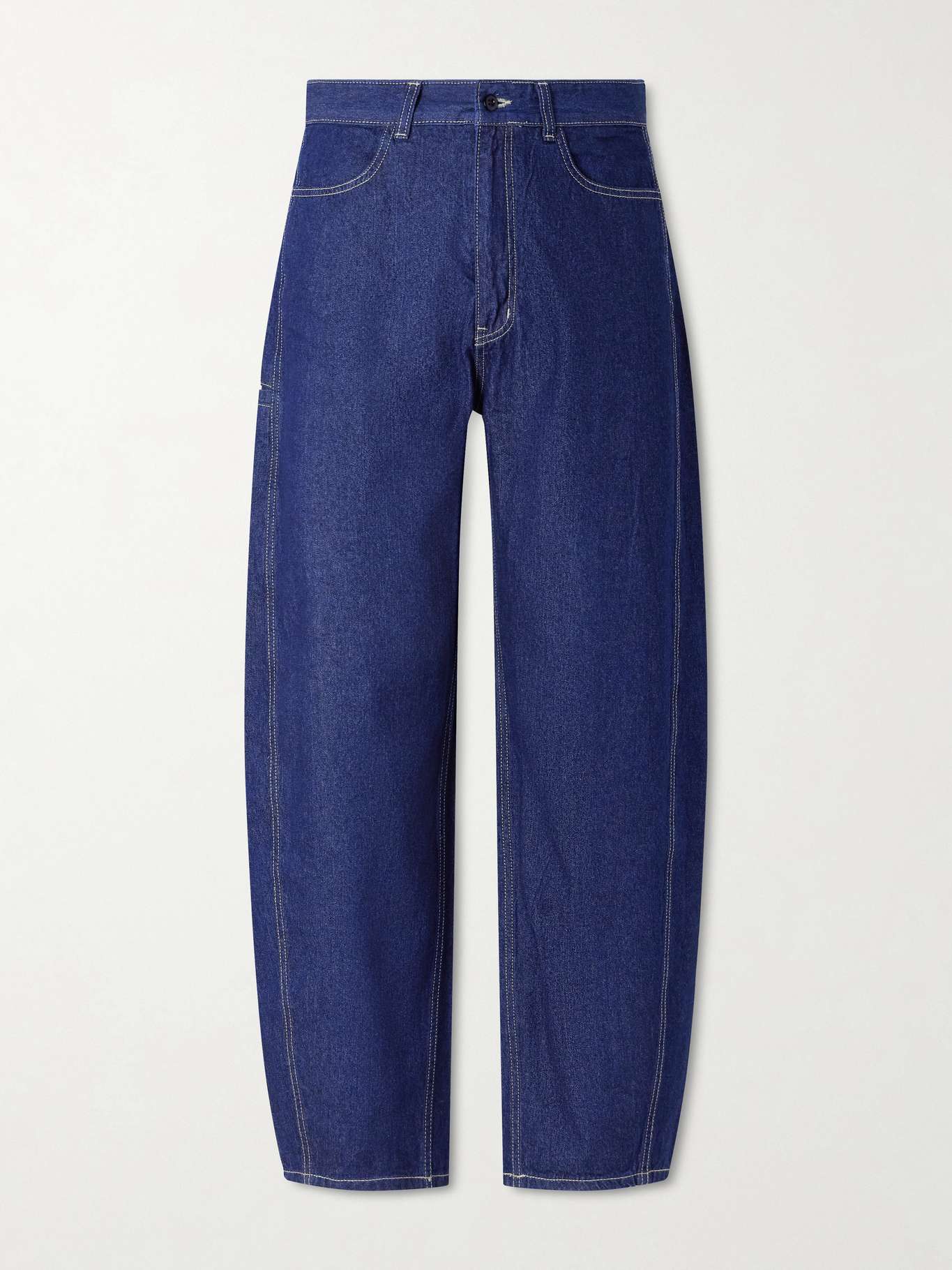 Inspired by vintage French workwear, FrizmWORKS' trousers are cut from softly washed denim in a curved balloon shape with a relaxed, structured wide-leg fit that avoids excess volume. A small coin pocket at the top of the leg adds a utilitarian detail.