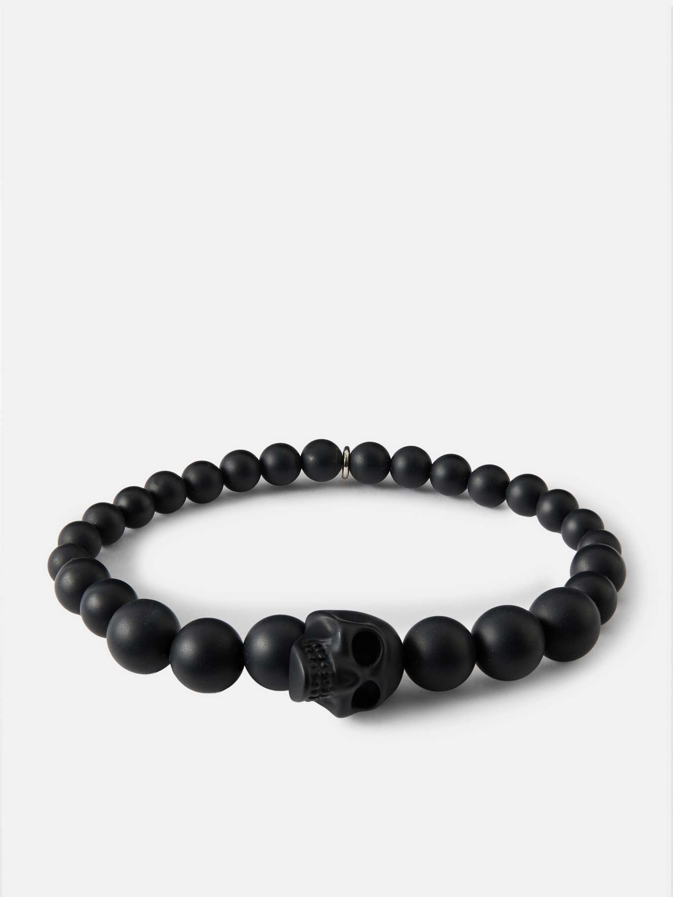 A black skull adds a gothic accent to McQueen's beaded bracelet, crafted from matte black resin. Elasticated for comfort, it can be stacked for a playful, edgy look.