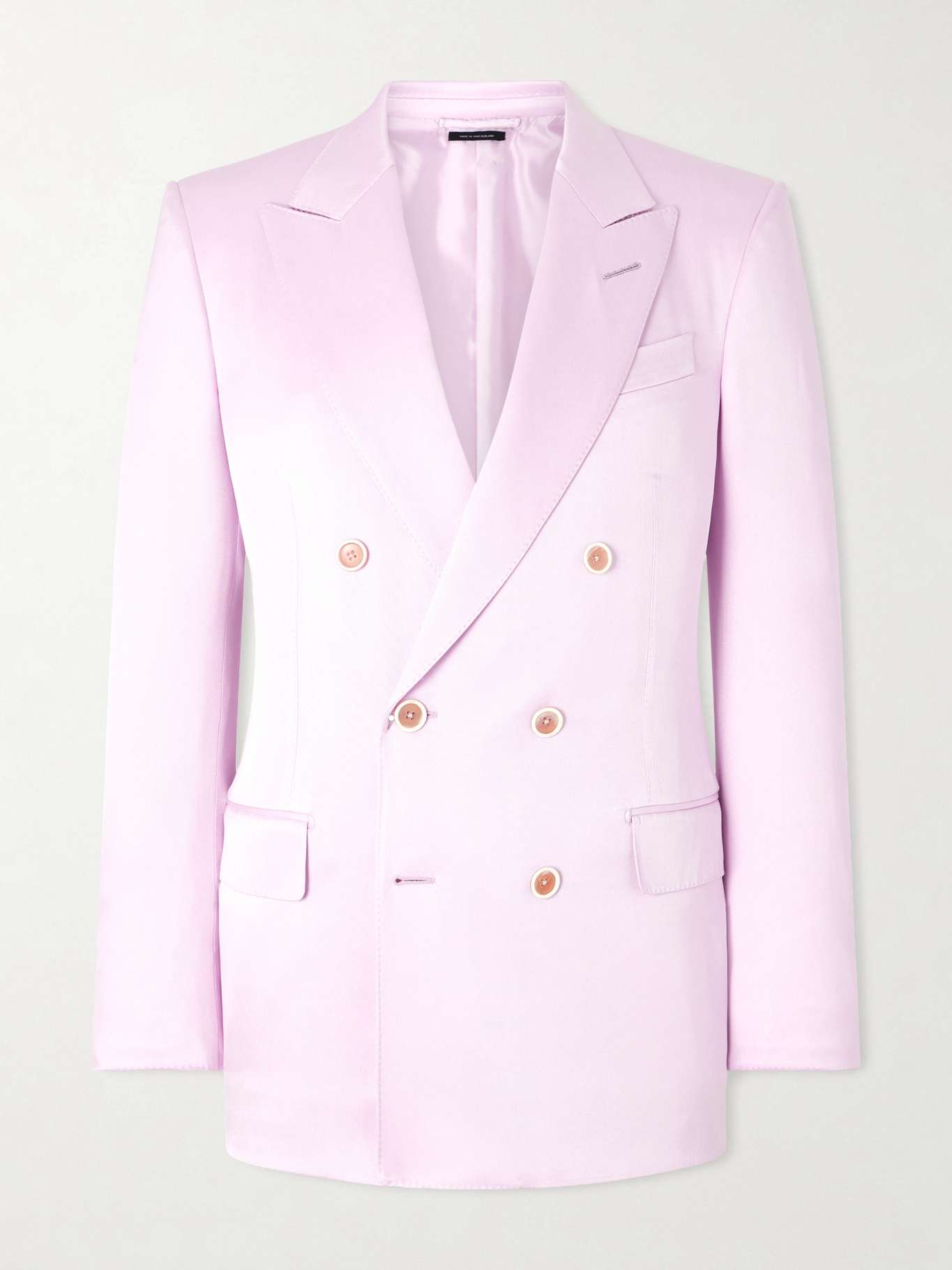 With Haider Ackermann at the helm, TOM FORD has doubled down on its signature tailoring. Similar to styles that walked his inaugural runway, this blazer has been made in Italy from pink silk-gabardine and cut in a structured, double-breasted shape. Strong shoulders and peak lapels define the design.