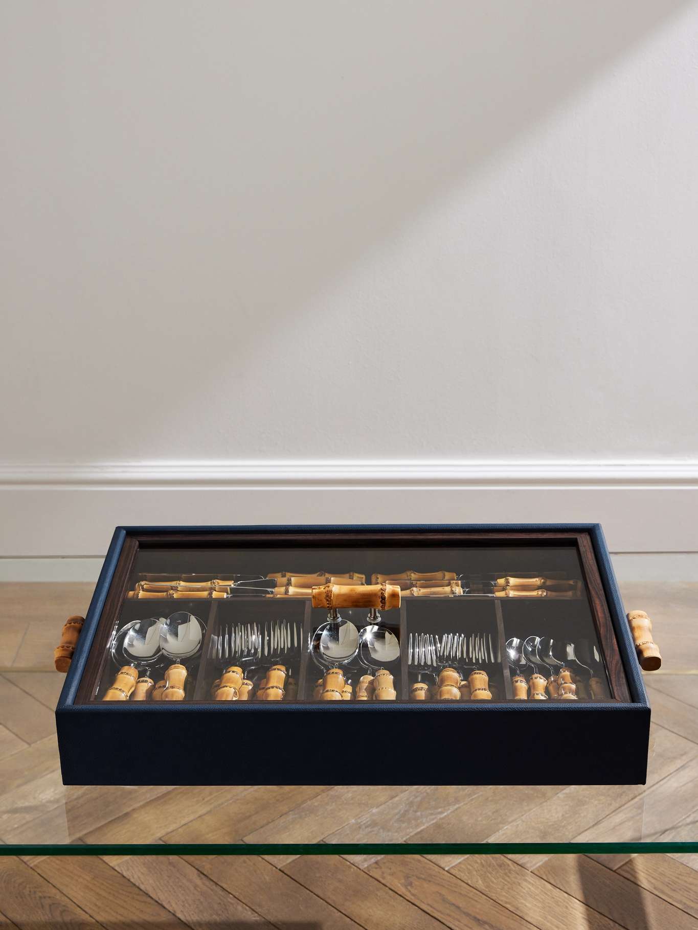 Lorenzi Milano favours bamboo because it's lightweight and flexible yet still durable. This stainless steel tableware set is carved with wood and bamboo handles and comes in a beautiful leather presentation box.