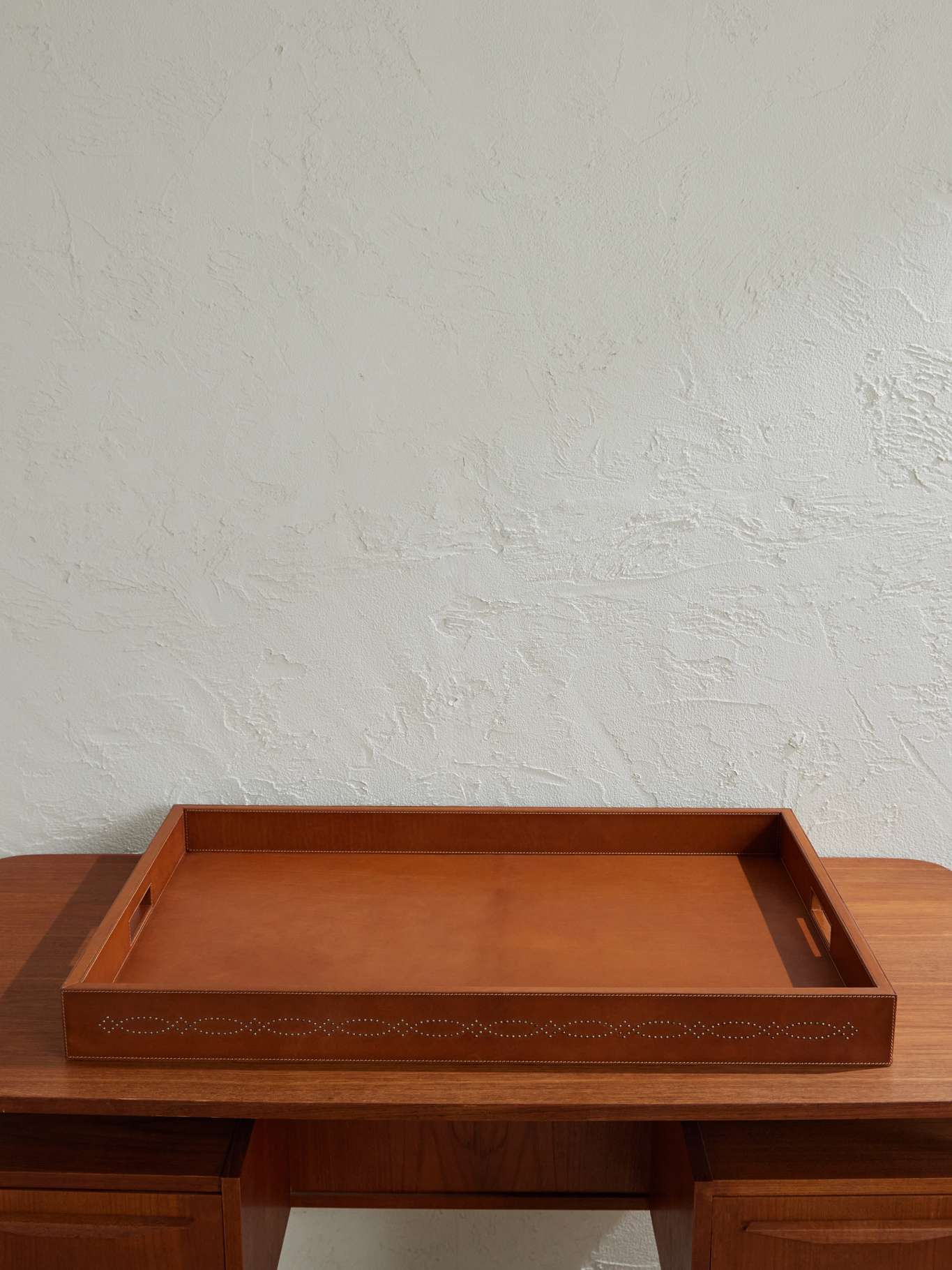 Inspired by a vintage bracelet, the studded stitchwork pattern tracing Ralph Lauren Home's 'Bromley' tray has a distinctive Western charm. It's made from smooth leather that promises to earn a rich patina over time and is sized to hold candles, trinkets or desktop essentials.