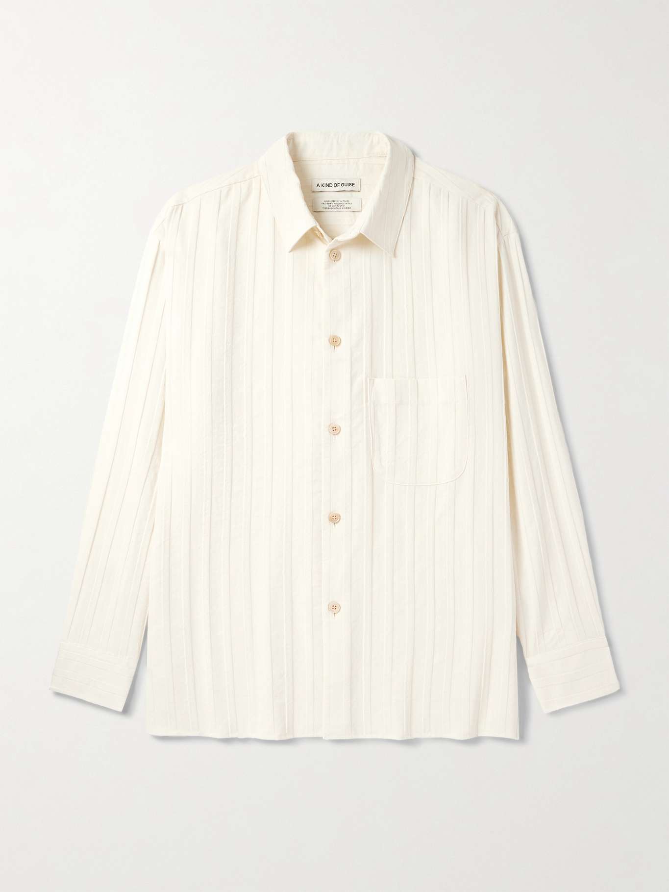 You'll find a few iterations of A Kind of Guise's signature 'Gusto' shirt in our edit. This style is woven with touches of wool and patterned with wide, textured stripes. Leave a few of the mother-of-pearl buttons undone for a relaxed feel.