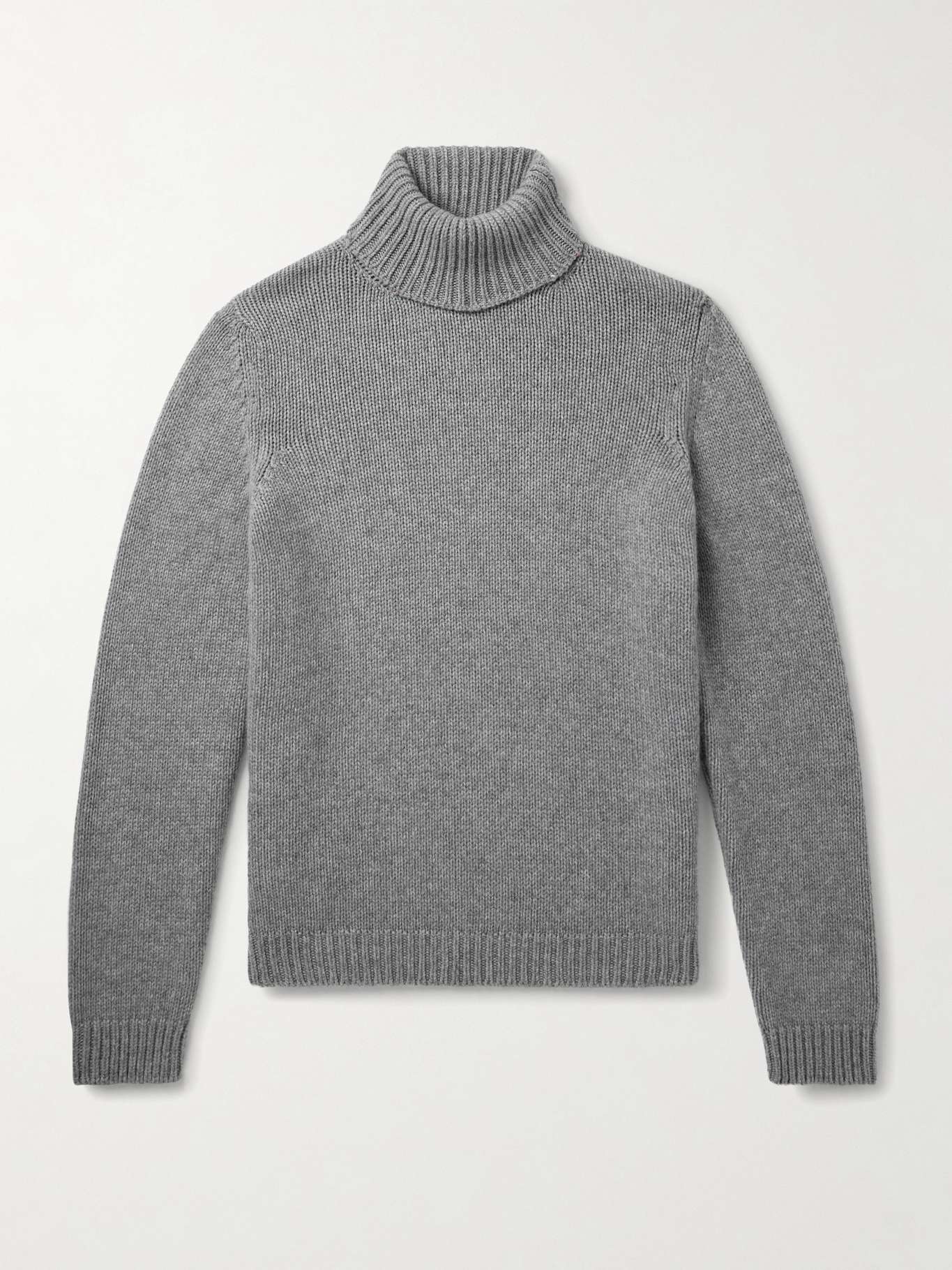 Anderson & Sheppard's sweater is knitted from sumptuous cashmere with a thick handle. It has defined ribbed trims and a cosy rollneck.