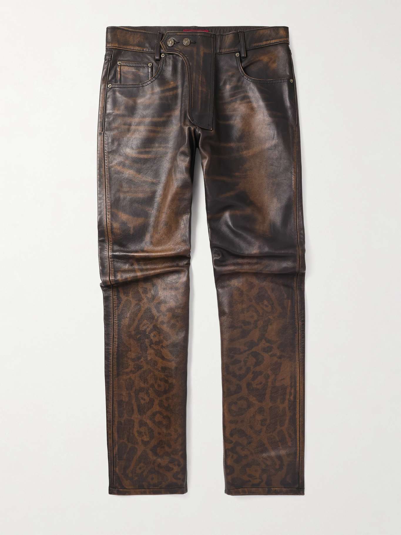 To 424, "leopard is the new camo" – you'll find the print throughout its AW25 collection. Seen at the bottom of these trousers, they're made from brown leather and cut in a classic five-pocket profile with relaxed straight legs. Note the holster-like placket at the front.