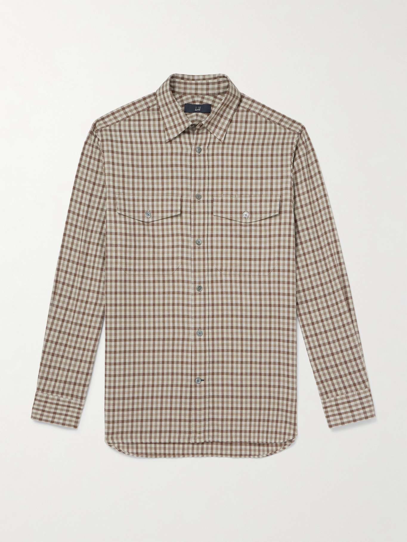 Dunhill's shirt is woven with checks in a neutral palette, giving it a cosy countryside feel. It's made from a cotton and cashmere-blend that's brushed for a tactile finish and has two utility-style flap pockets on the chest. Note the subtle black stitching on the bottom buttonhole.