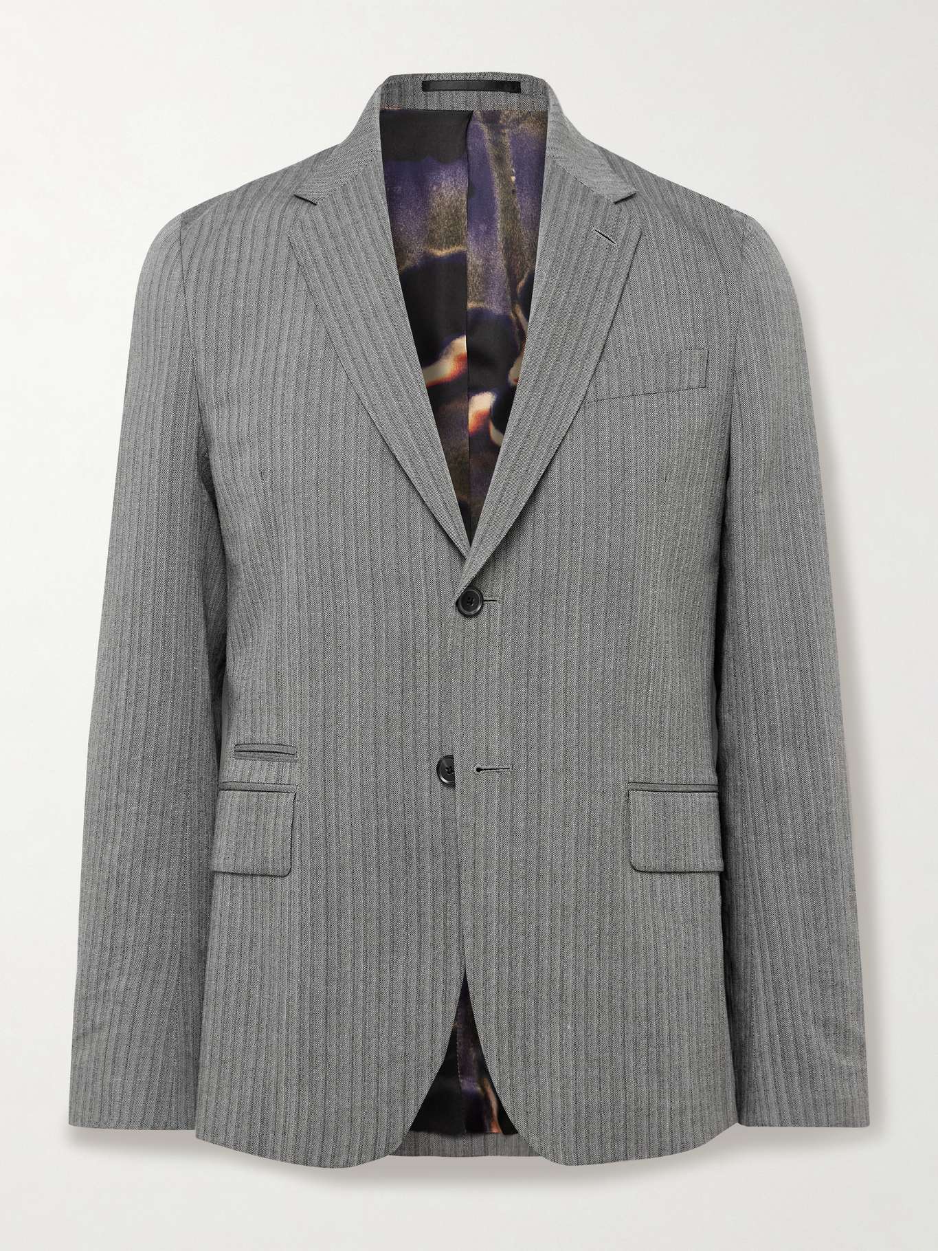 Paul Smith's suit jacket is woven in a striped herringbone motif using black and white threads that look grey from afar. It's blended with plenty of virgin wool and features a signature artful pattern along the satin lining.