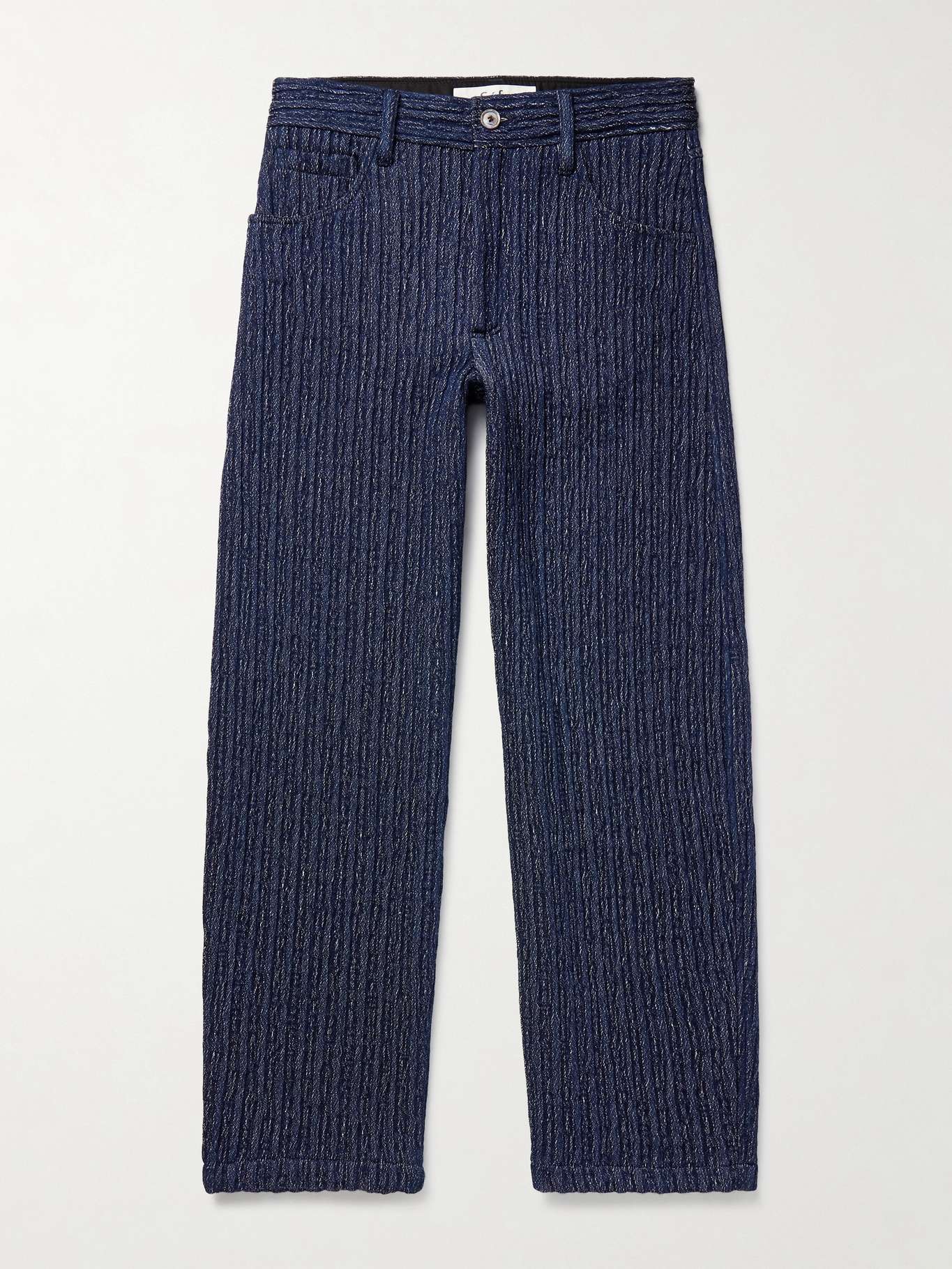 Séfr's 'Nasedo' trousers are intricately ribbed to mimic the effect of rippling water. Tailored from cotton-blend bouclé, they have a relaxed, barrel-leg shape and a logo-debossed suede patch at the back.