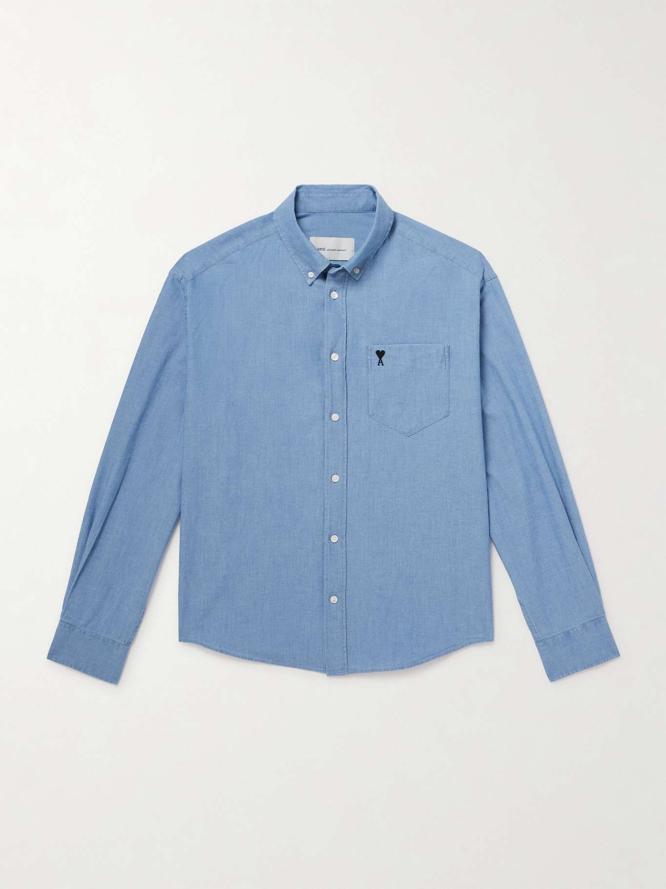 AMI PARIS Button-Down Collar Logo-Embroidered Cotton-Chambray Shirt