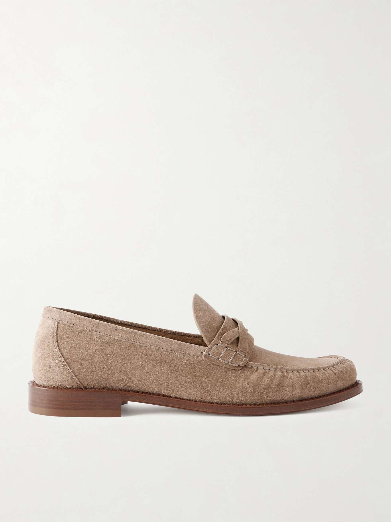 Brunello Cucinelli's 'Flex' loafers are defined by the twisted bands at the vamps. Named after their lightweight rubber soles, they've been handmade in Italy from suede and stitched with tonal threads along the collars, aprons and penny slots.
