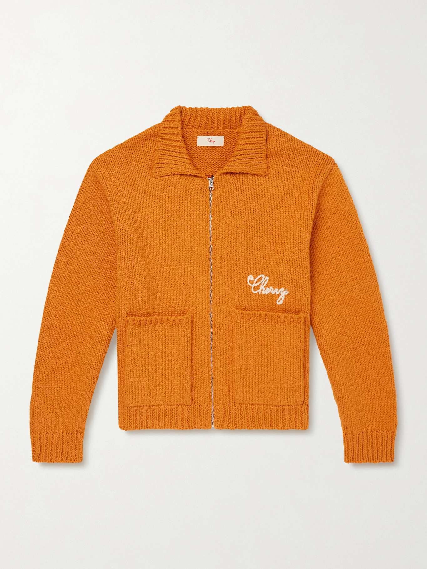 Cherry Los Angeles gets its sense of style from retro Americana. This zip-up cardigan is knitted from vibrant orange cotton with a logo stitched above the right pocket. Turn it over to reveal the ‘1 Star’ flag motif on the reverse.