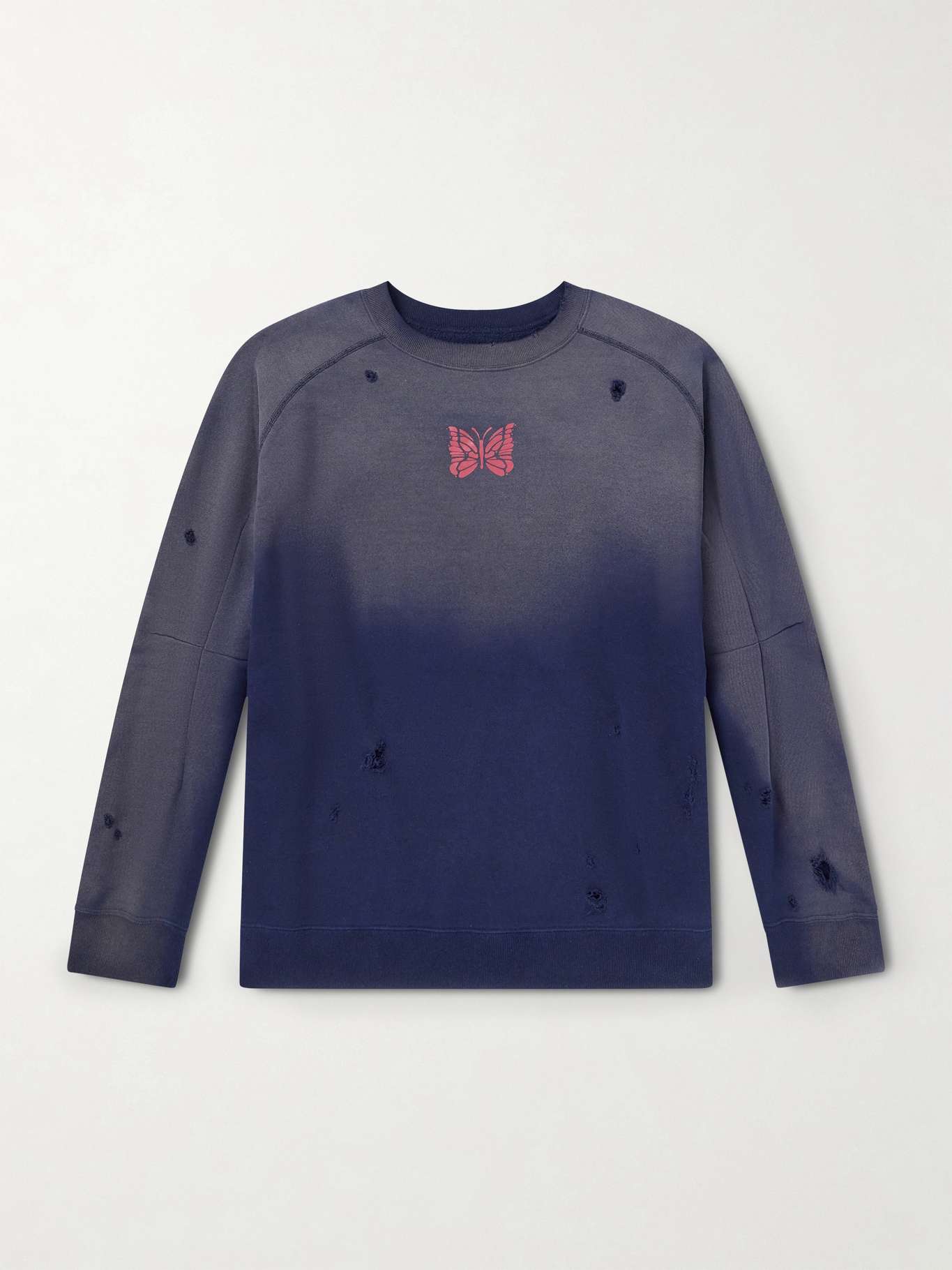 You'll know this sweatshirt is by Needles from its iconic 'Papillon' logo. It's cut from cotton-jersey and distressed with rips, pulls and tears. The washed navy hue has a dégradé effect from top to bottom.