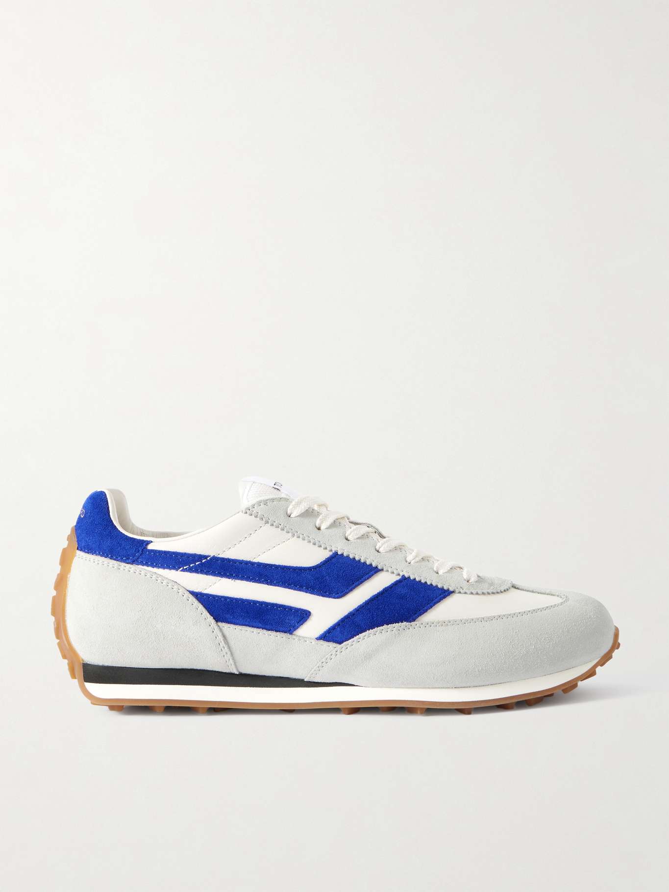 TOM FORD's leather sneakers are detailed with two-tone suede trims forming the signature 'T' logos along the sides. They have a mesh tongue and embossed rubber soles that extend onto the toes and heels.