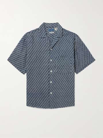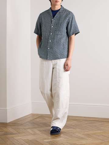 Camp-Collar Printed Indigo-Dyed Linen Shirt