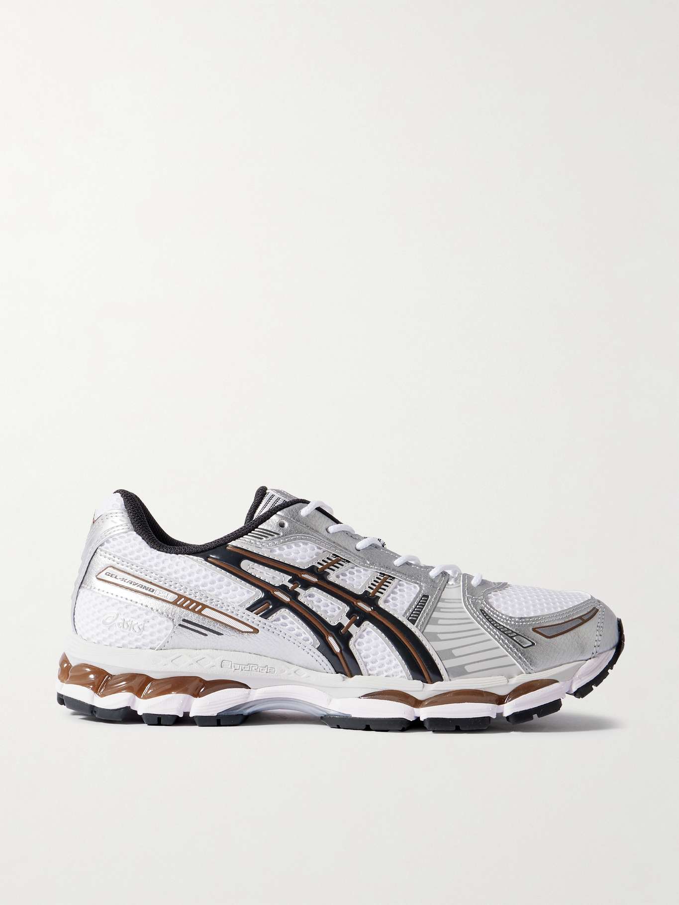 ASICS' 'GEL-KAYANO 12.1' sneakers are a 2006 model revived with fresh specs. Originally designed for marathon running, this pair has GEL® inserts with a FLUIDRIDE™ construction – keeping you comfortable when step counts are high. They're made from breathable mesh with metallic trims throughout.