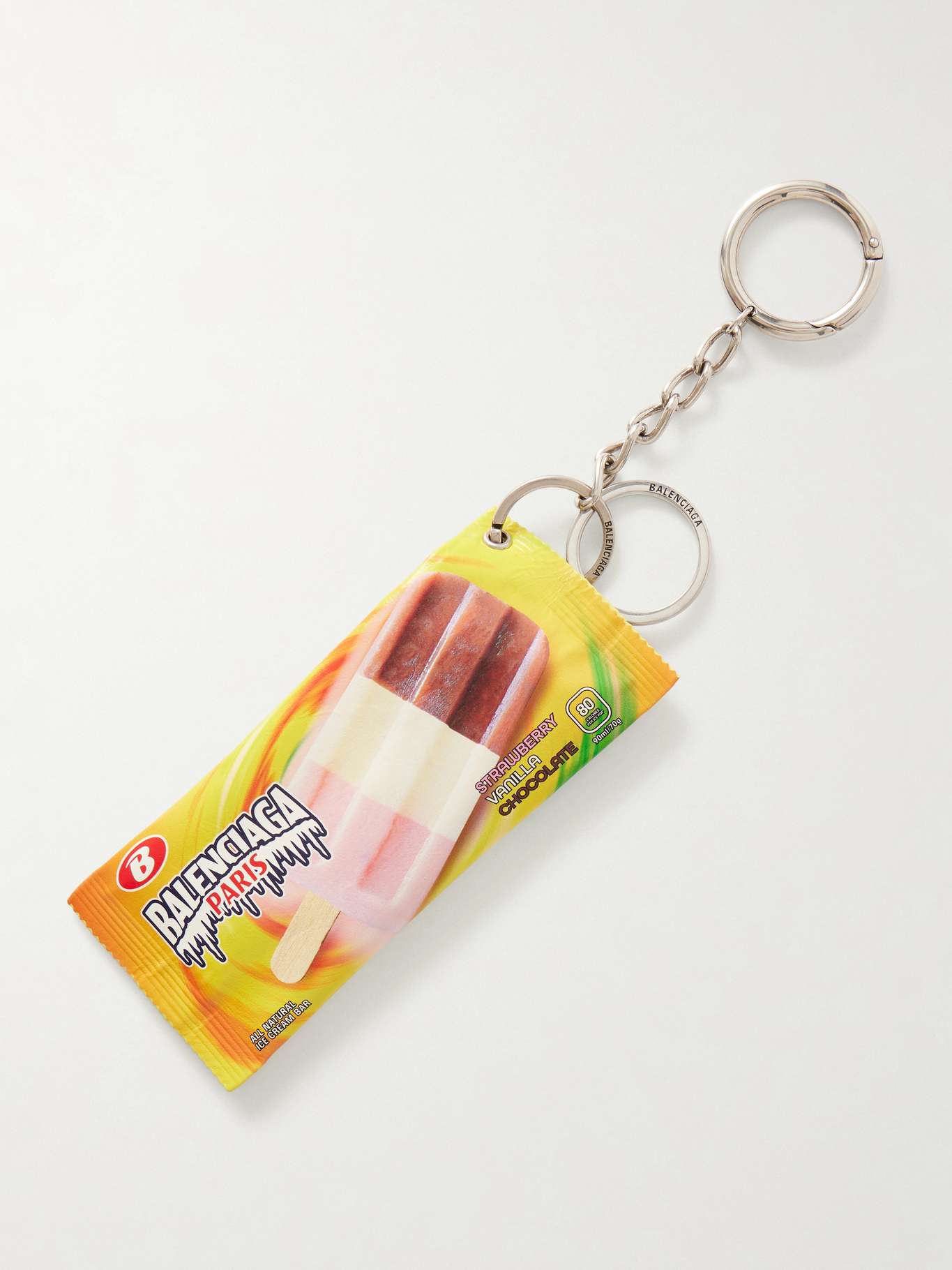 Playfully shaped and printed to resemble an ice cream wrapper, Balenciaga’s ‘Snack’ pouch brings wit to small essentials. Crafted from smooth leather, it’s sized for cards and lip balm and finished with a silver-tone keyring to attach keys or secure it inside a larger bag.