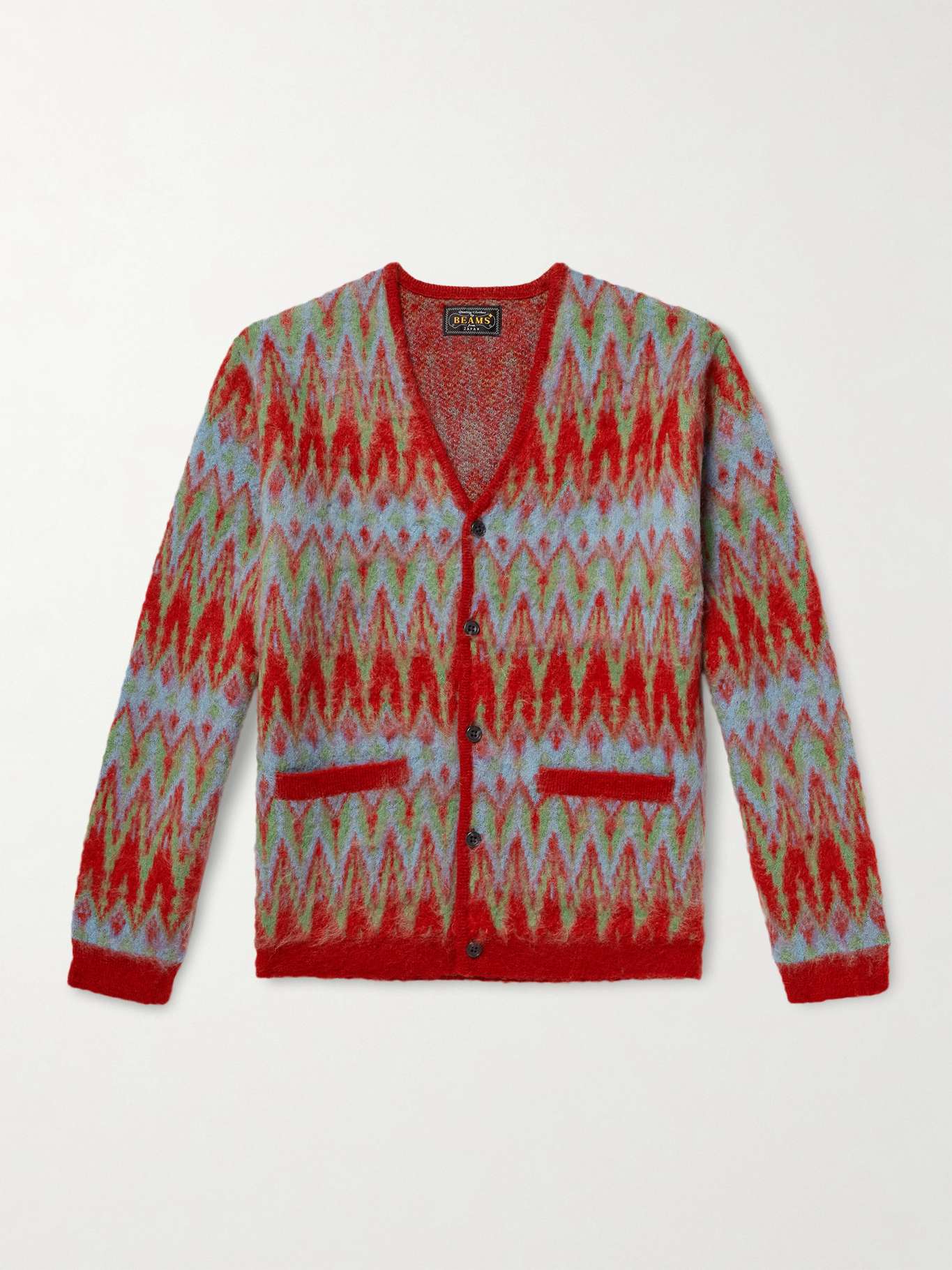 BEAMS PLUS' cardigan is jacquard-knitted with doubled chevron stripes - it's a little trippy, especially with the blurred, fuzzy texture. The yarn is blended with touches of wool and mohair.