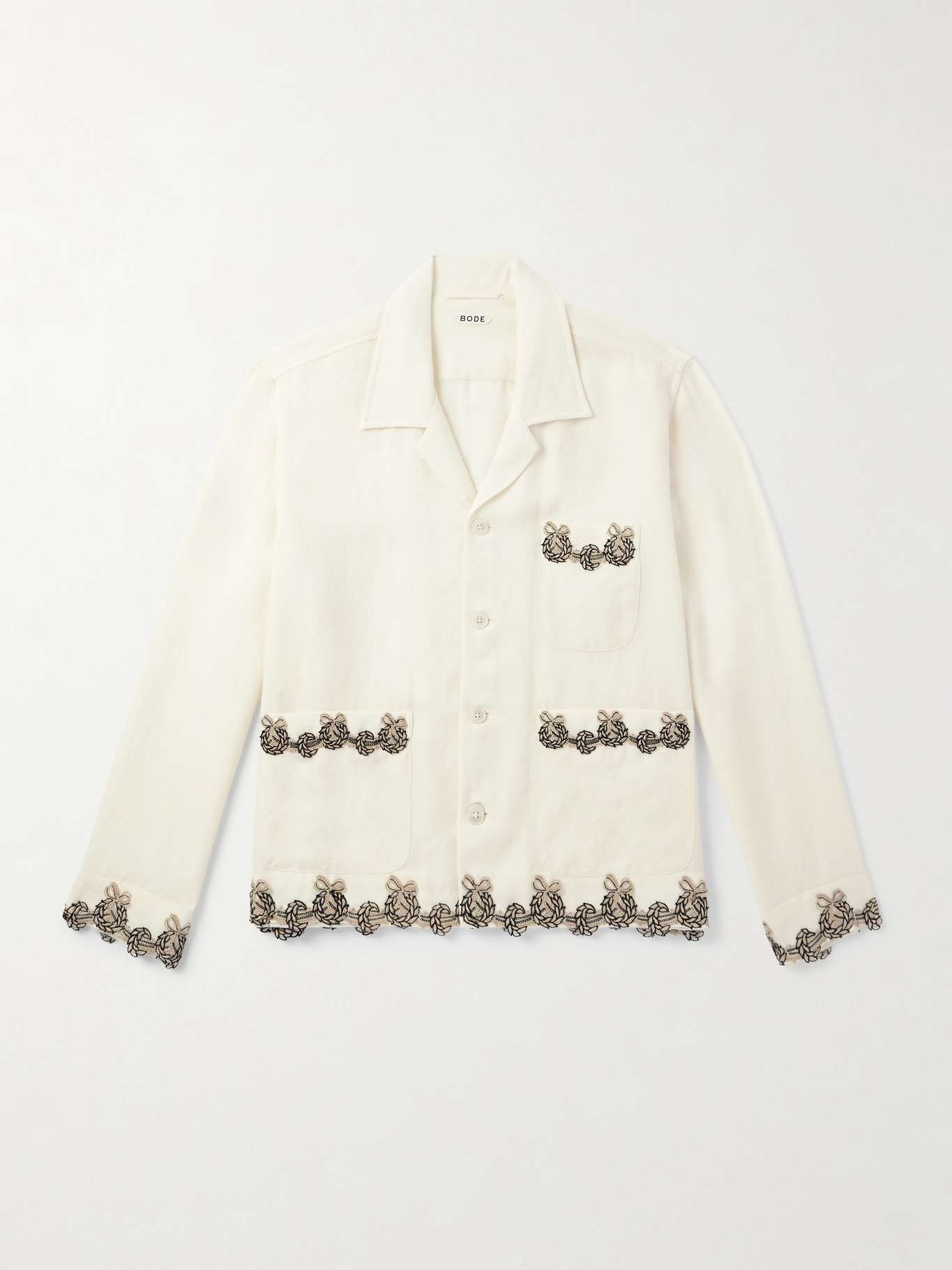 BODE's collections are rich with details inspired by heritage techniques and textiles. This 'Laurelist' overshirt is made from wool-flannel and detailed with wreath and garland appliqués inspired by vintage Parisian passementerie trims.