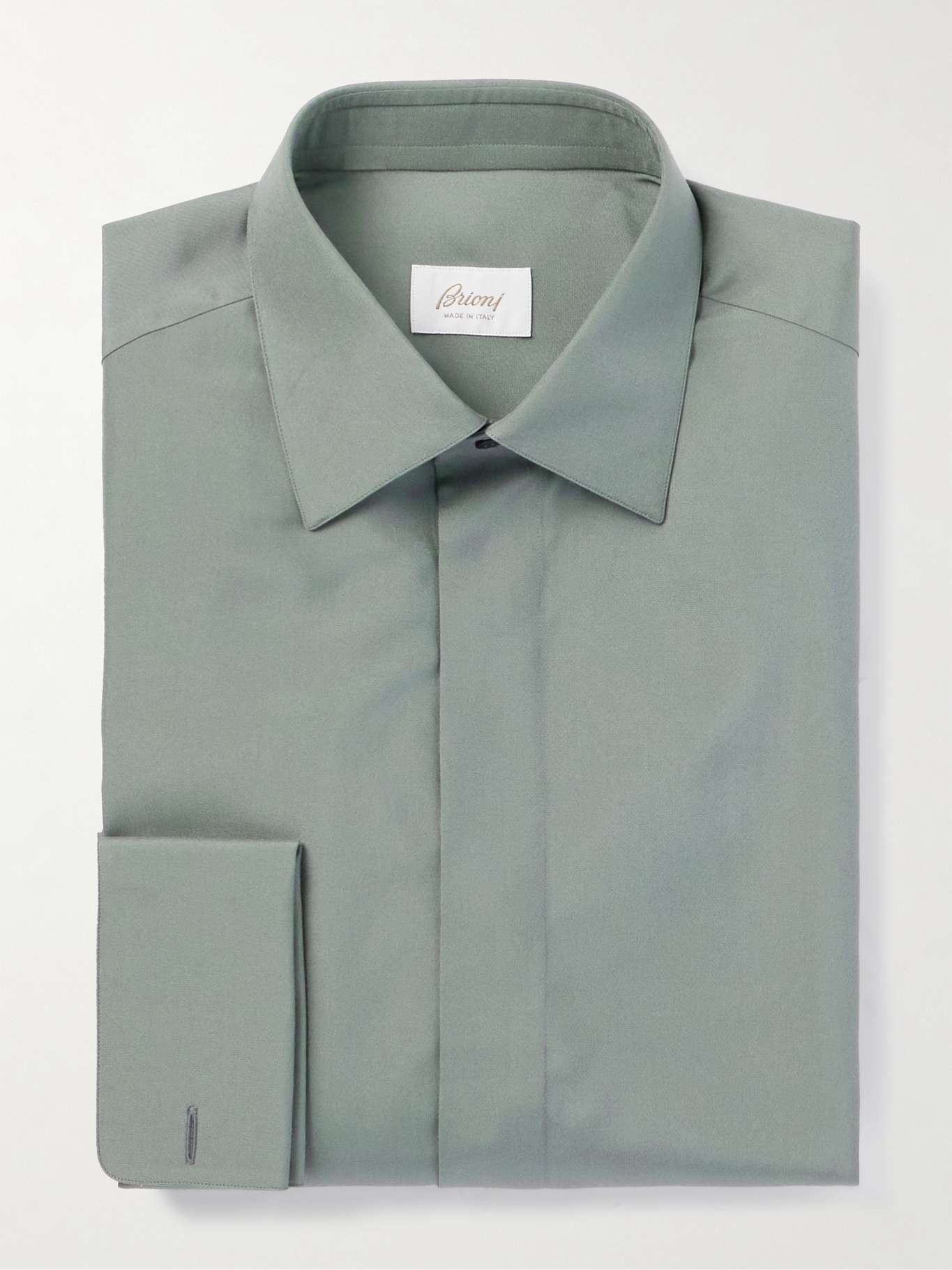 Brioni has produced fine shirting for more than 75 years. Designed with a streamlining covered placket, this Italian-made style is cut from lustrous silk-satin and has a spread collar to accommodate a Balthus Knot or Full Windsor.