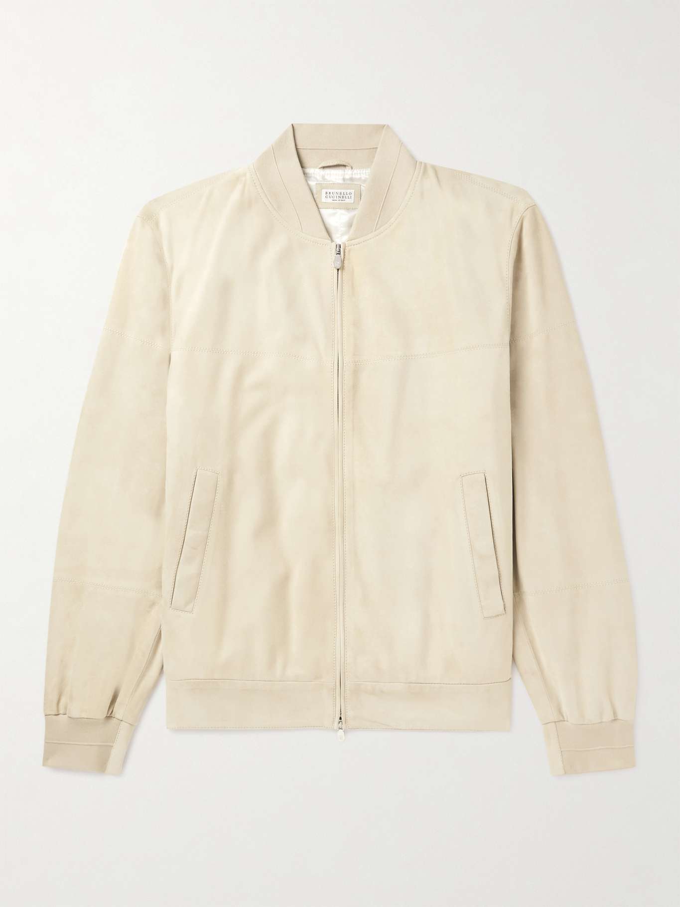 EXCLUSIVE AT MR PORTER. Brunello Cucinelli's take on the classic bomber jacket has been crafted in Italy from supple nubuck in a versatile cream shade the label aptly calls 'Biscuit'. It's fully lined for easy layering and fastens with logo-engraved zipper pulls.