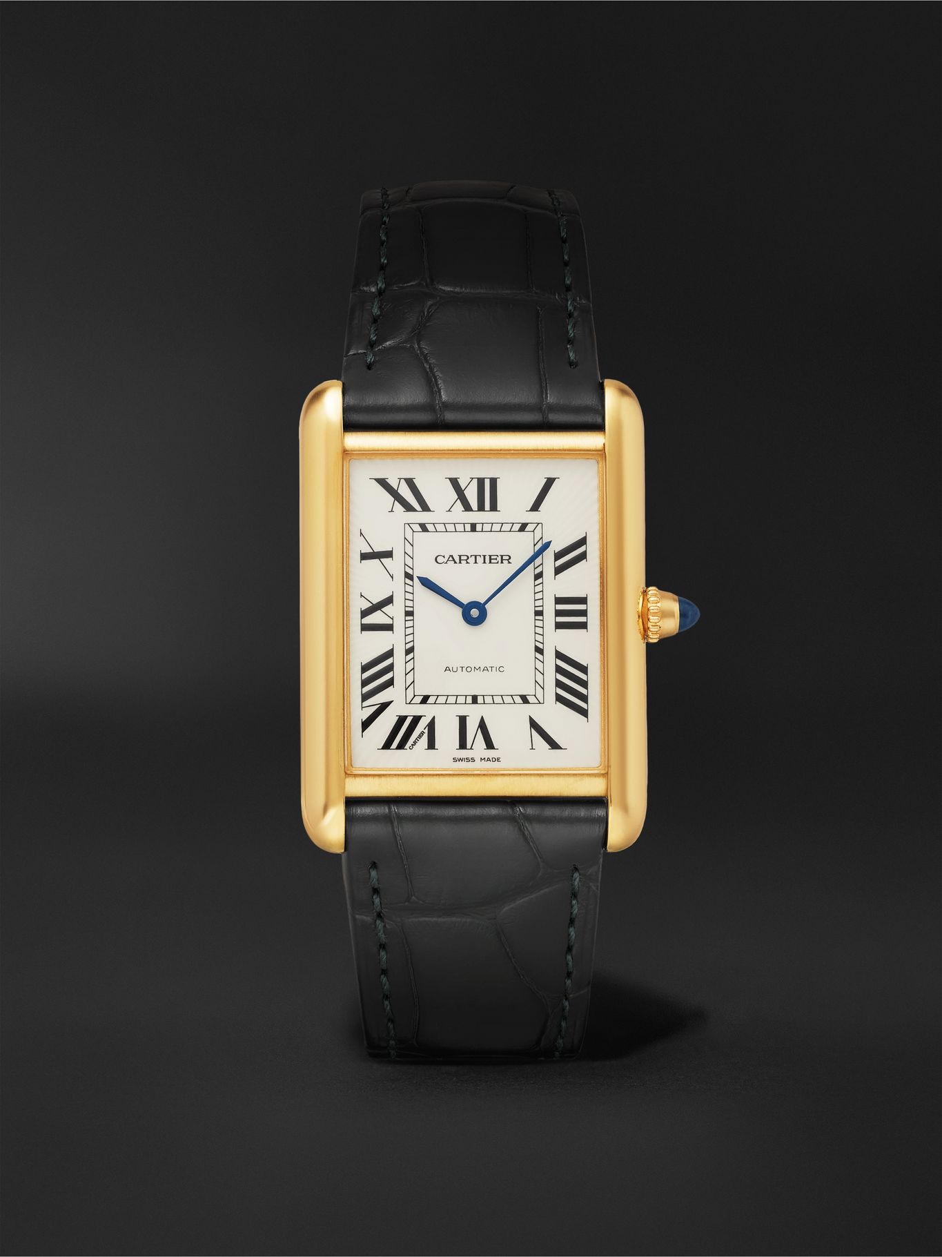 Defined by its Art Deco-inspired clean lines and rounded corners, Cartier's sleek 'Tank Louis Cartier' watch is named after its founder who would wear this style himself - a true sign of its timelessness. Crafted from 18-karat gold and powered by an automatic movement, this reference has a silvered dial that makes the black Roman numerals easy to read. The black alligator strap will become even more supple with age.