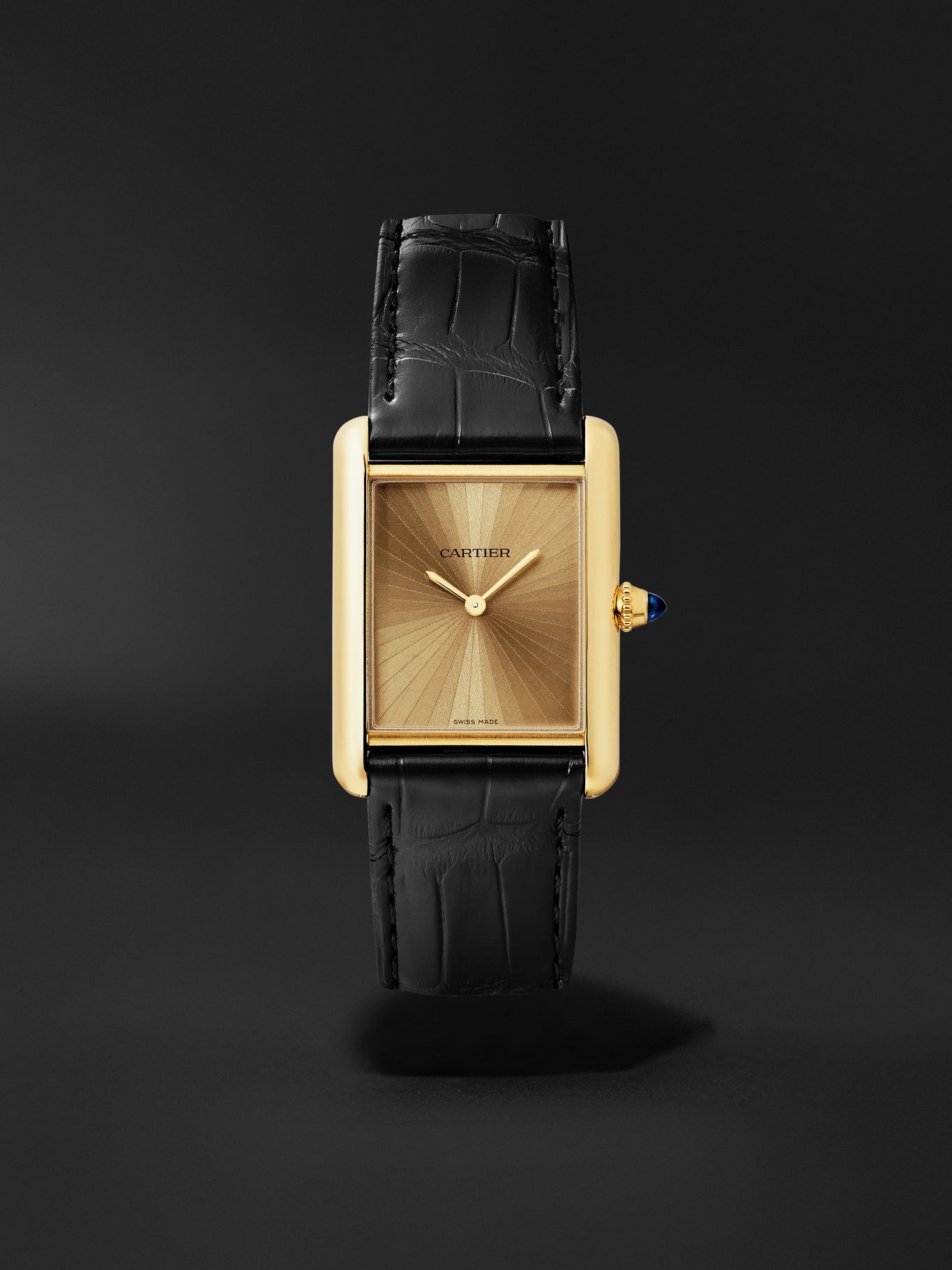 Over a century on from its debut in 1917, Cartier's iconic 'Tank' timepiece stays true to original design which drew inspiration from the shape of military tanks viewed from above. Updated with a modern sunray dial free of the usual numerals and markers, this medium 33.7mm model is crafted from 18-karat gold and set on a glossy alligator strap.
