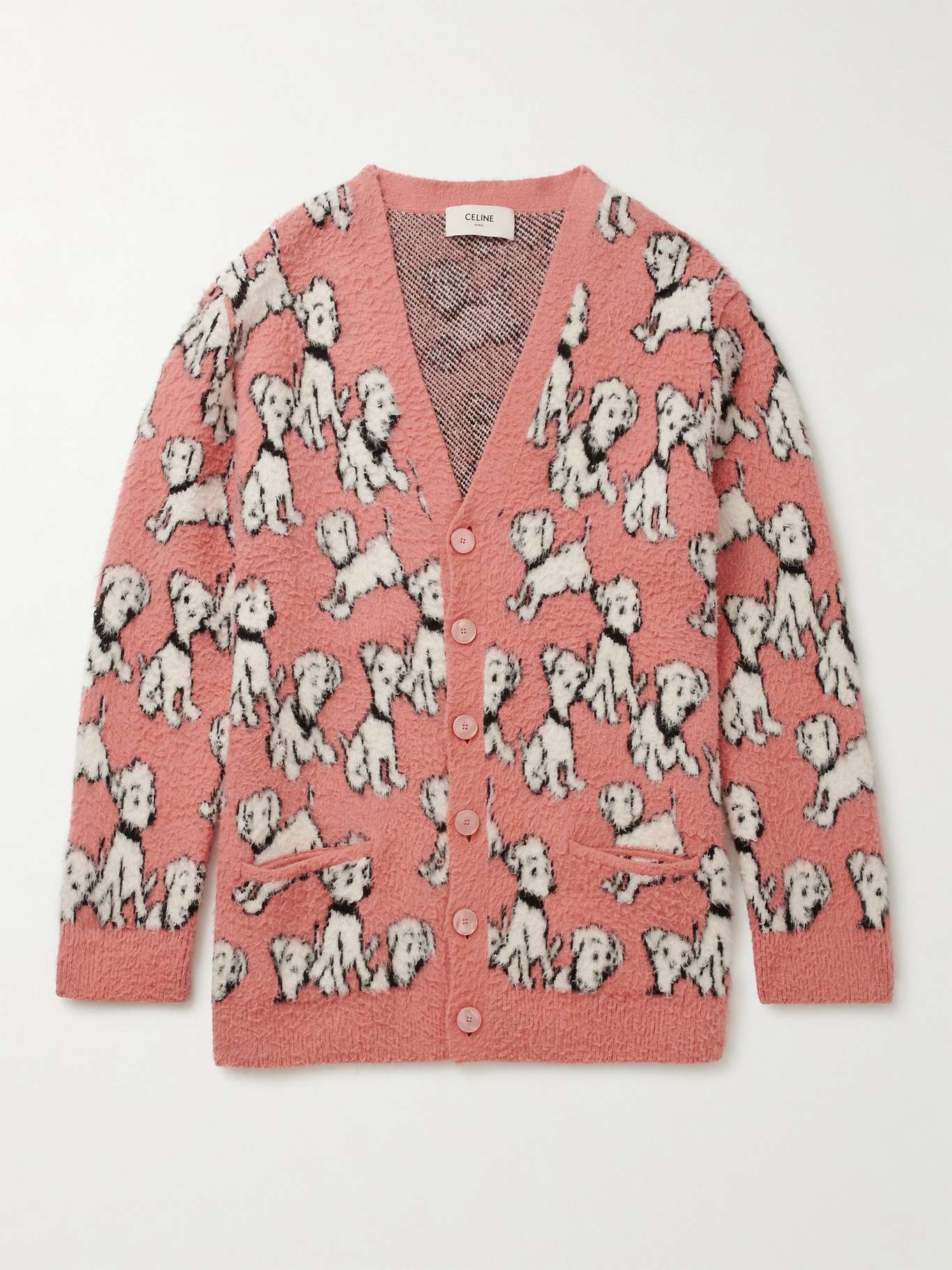 Hedi Slimane is back with CELINE HOMME's SS22 collection and this time he's bringing puppies along for the ride, along with 14 freshly commissioned artists. Dotted with furry dalmatians, this softly brushed cardigan is knitted from pink, white and black cotton-jacquard. Take a size up to make the loose fit oversized and the sleeves even longer.