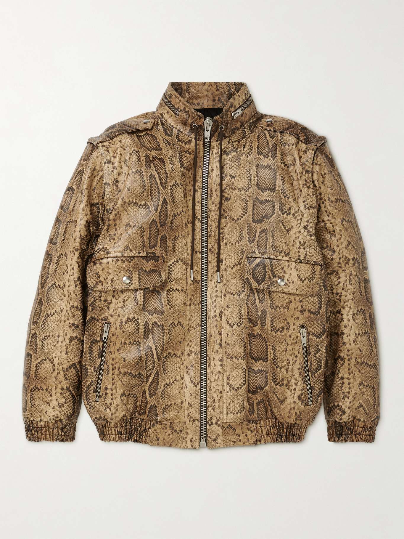 CELINE HOMME's snake-effect leather jacket feels both retro and fresh. It's cut for a slouchy fit and spliced with zips across the collar and back. Detach the sleeves to change up the look.