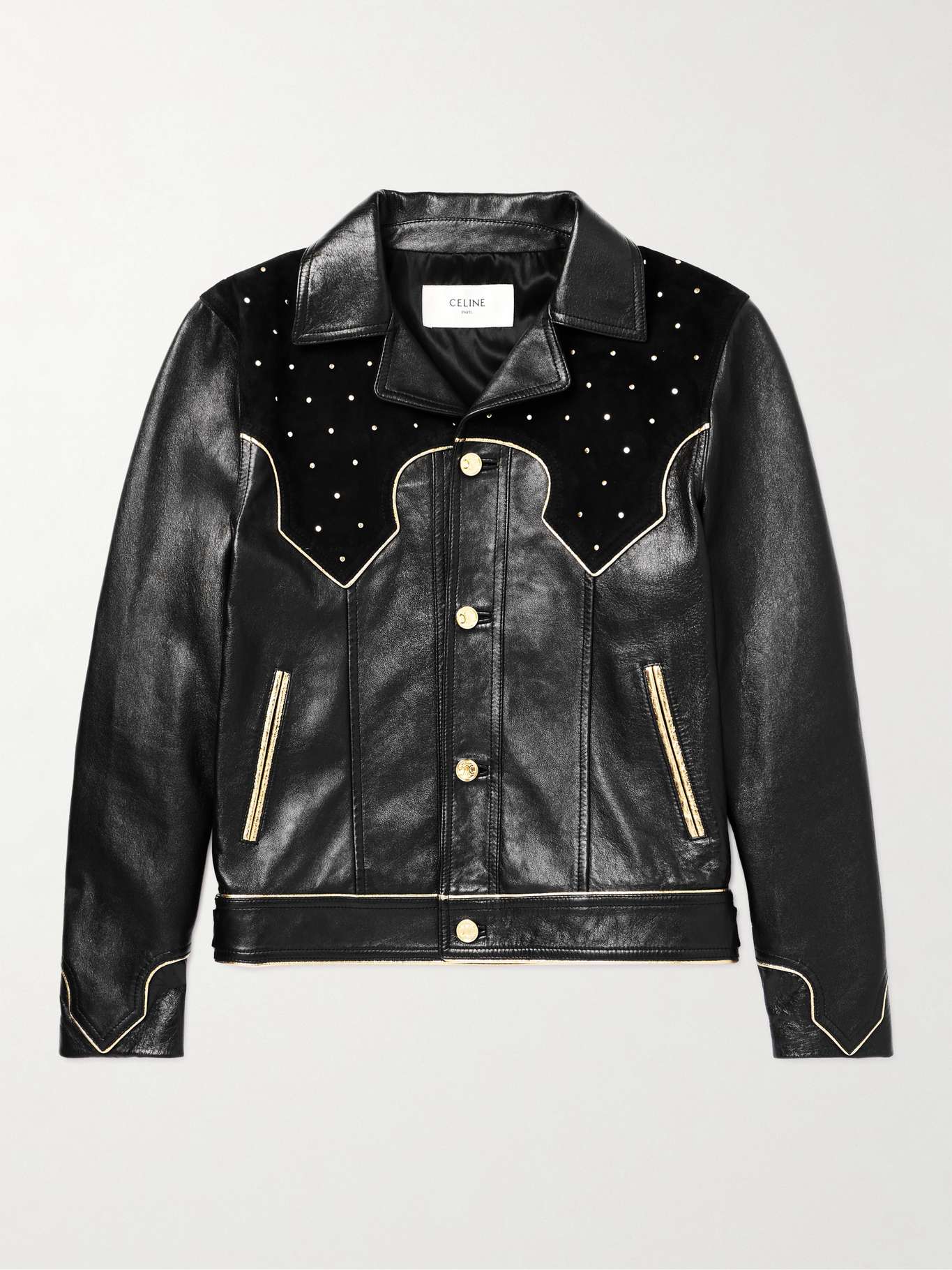 CELINE HOMME took to Paris' nightclub Le Palace to debut its FW23 collection - an ode to the hedonism of the '80s. True to that era, this jacket has been expertly tailored in Italy from supple leather and detailed with a studded suede Western-style yoke.