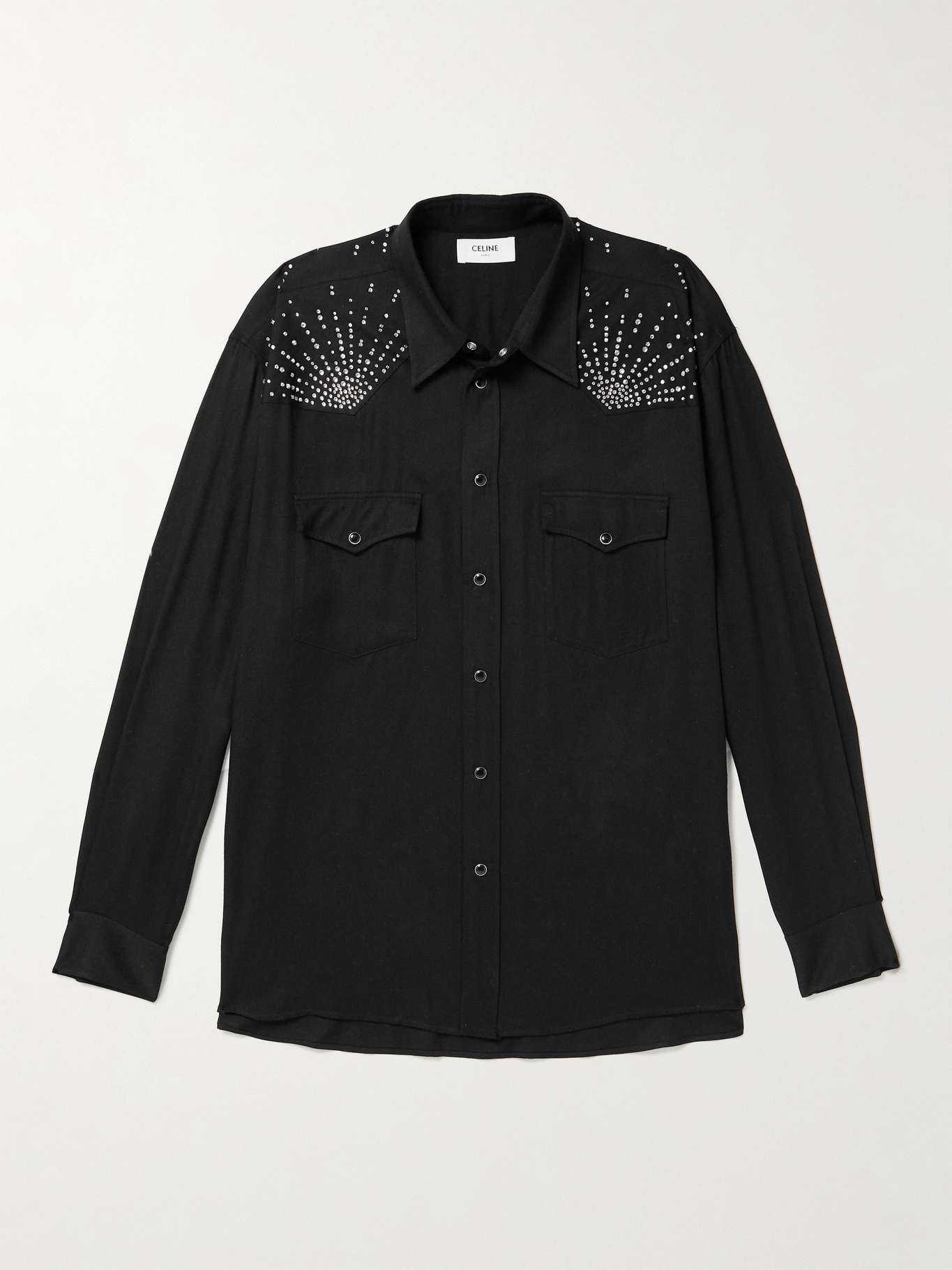 The crystal embellishments on Celine Homme's shirt are positioned to form two starburst patterns across the shoulders, with a larger version of the same motif across the back. Made from soft twill, this slouchy style is cut for a loose fit that's drapes wide on the arms. It's designed to be tucked into your waistband for a touch of structure.