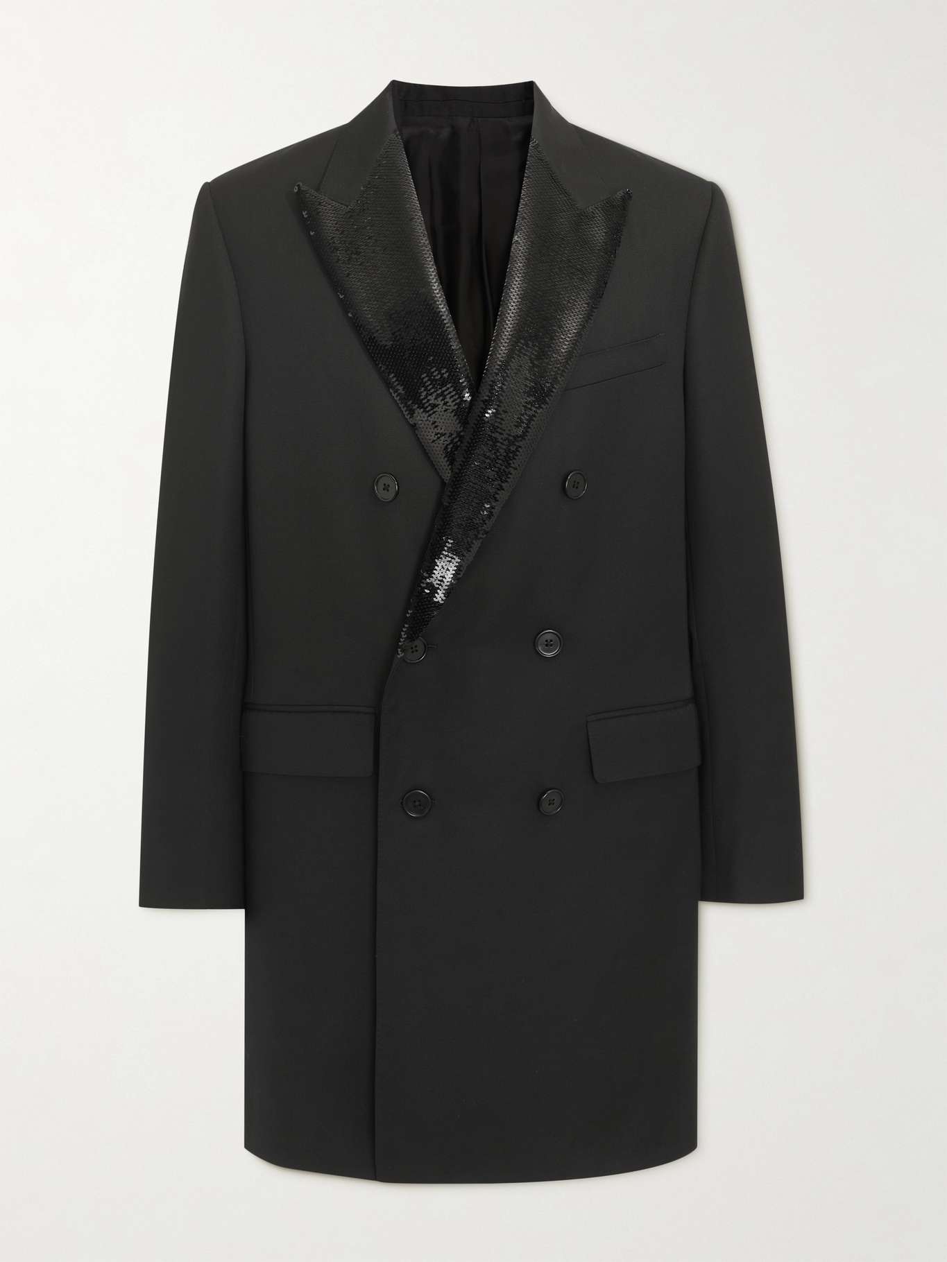 EXCLUSIVE AT MR PORTER. Much of CELINE HOMME's offering glistened in the Côte d'Azur sun during the SS22 presentation, and this coat is no exception - the peak lapels are embellished with sleek, dark sequins. It's tailored from weighty black wool in a classic double-breasted profile.