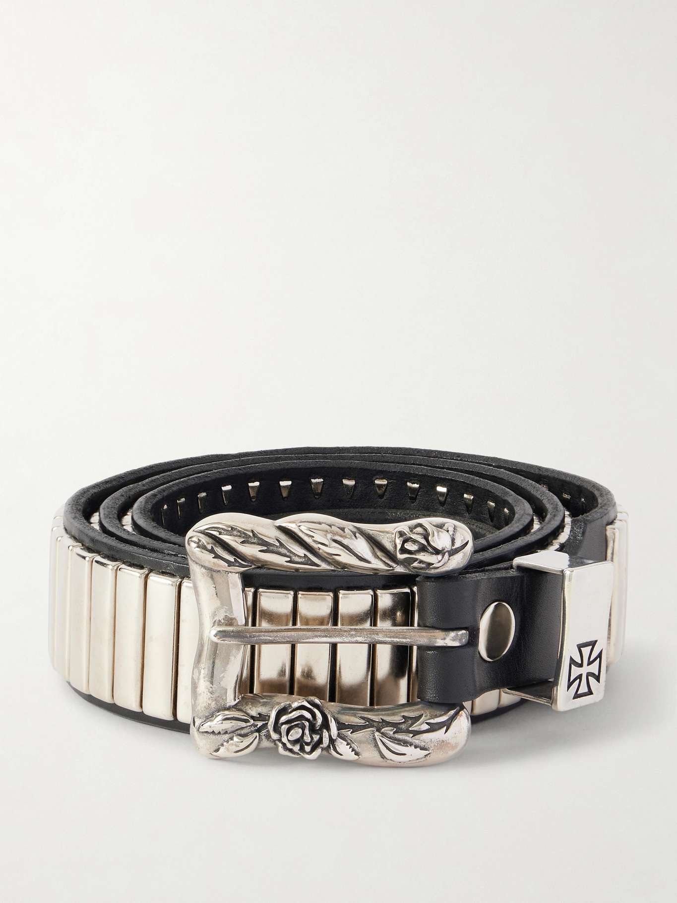 Enfants Riches Déprimés' 'Mechanic' belt is cut from heavy-duty leather and hand-studded all the way around. The buckle is custom cast from white bronze and features intricately sculpted roses and leaves.