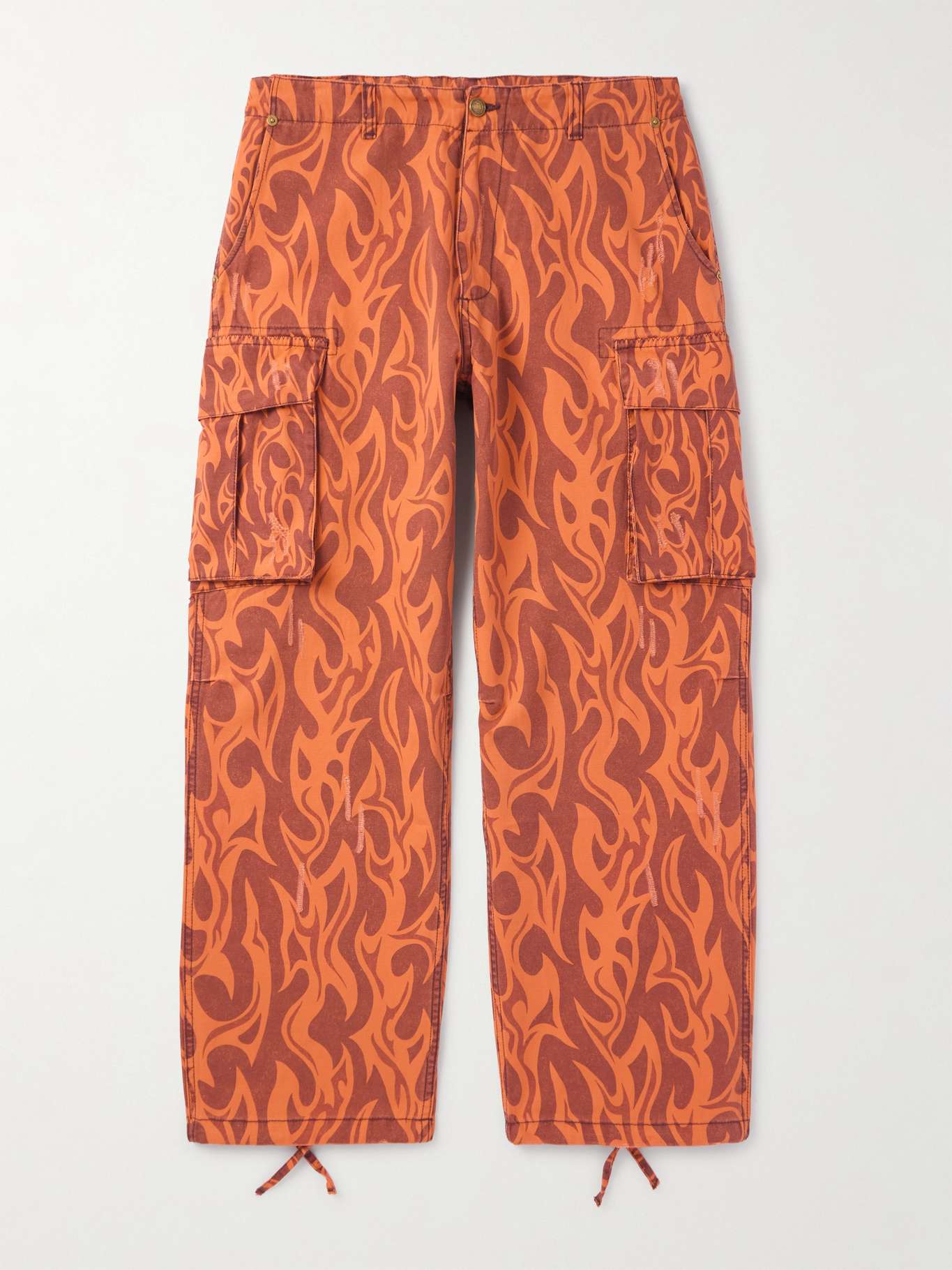 ERL's cargo trousers are printed with an engulfing flame motif in fiery orange and brown shades. Lightly distressed for a broken-in look and feel, they're cut from sturdy cotton-canvas and have drawstring hems to customise the fit.