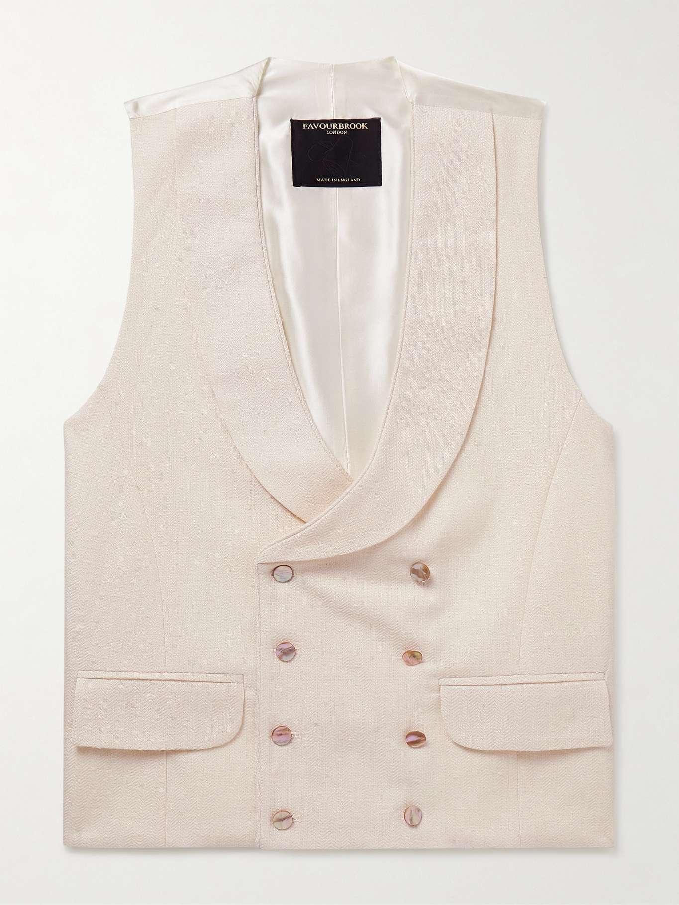 FAVOURBROOK Slim-Fit Shawl-Collar Double-Breasted Herringbone Linen-Blend and Satin Waistcoat