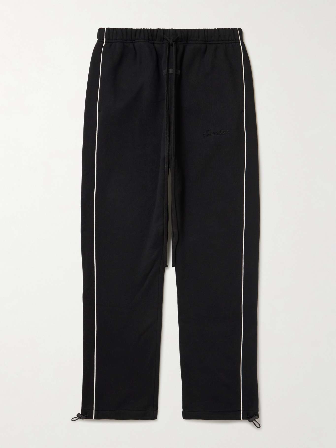 Half a tracksuit, Fear of God Essentials’ sweatpants are made from thick cotton-bend jersey that’s fleece-backed for comfort. Athletic piping stripes the legs, while toggles at the cuffs taper their fit. Note the logos embroidered and appliquéd.