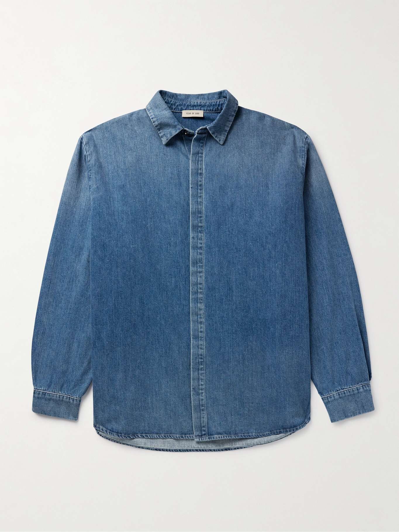 Fear of God’s shirt is cut for an oversized fit from Japanese denim that’s lightly faded to make it look like a well-worn favourite. It's minimally designed with a covered buttoned placket and a logo-embossed leather patch at the back.