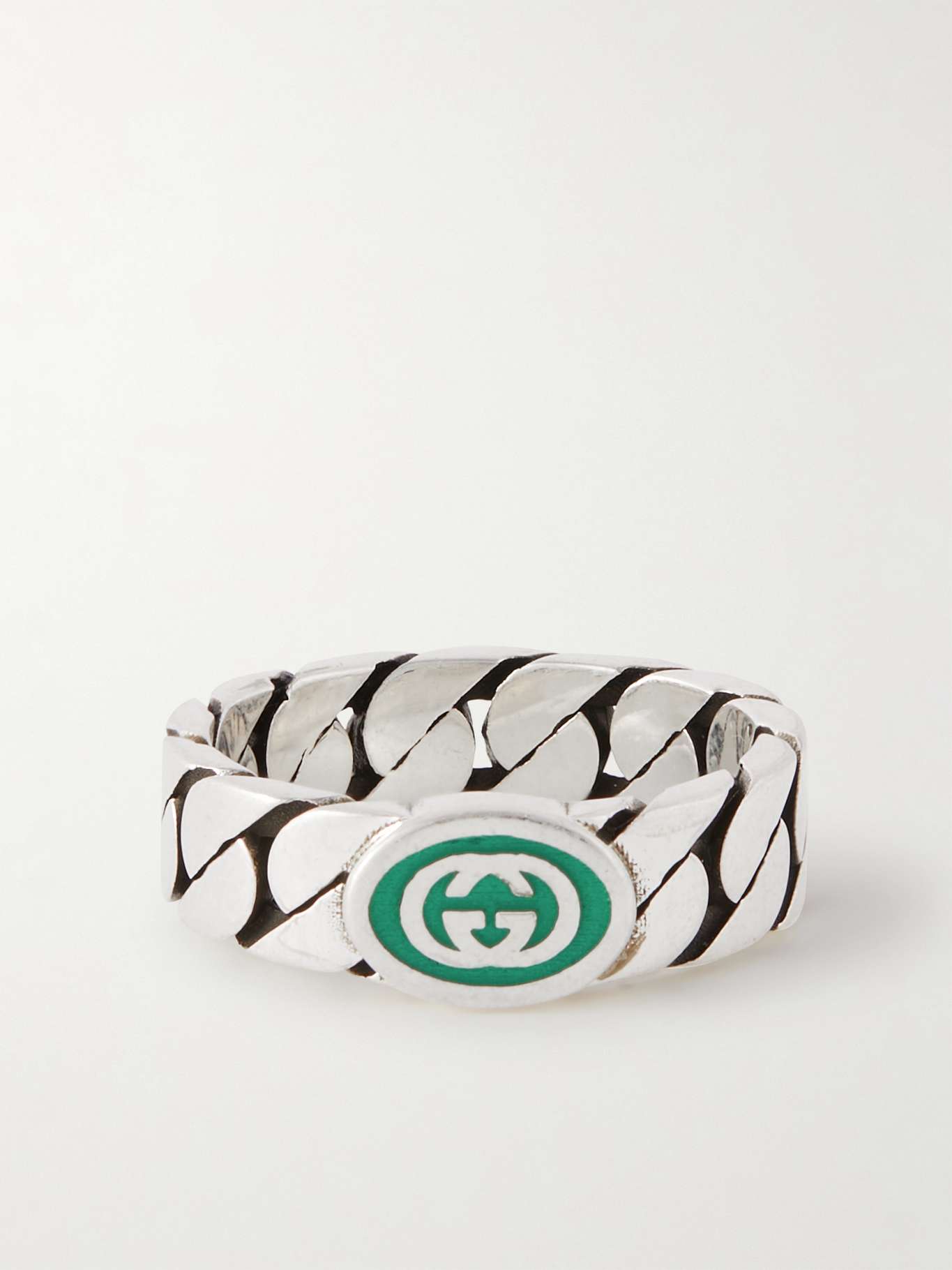 This ring has been crafted in a gourmette construction from sterling silver so it sits comfortably flat on your finger. The green enamelled setting is finished with the label's signature interlocking 'G' emblem.