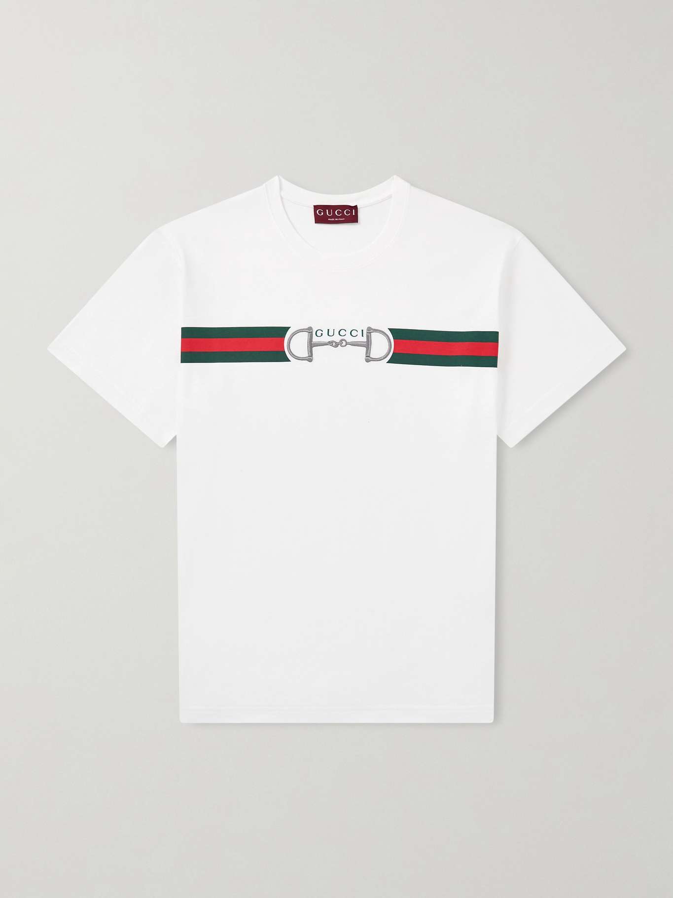 Gucci's T-shirt is embroidered with its iconic horsebit motif at the chest. It's cut for a relaxed fit from lightweight cotton-jersey and printed with green and red stripes at its centre.
