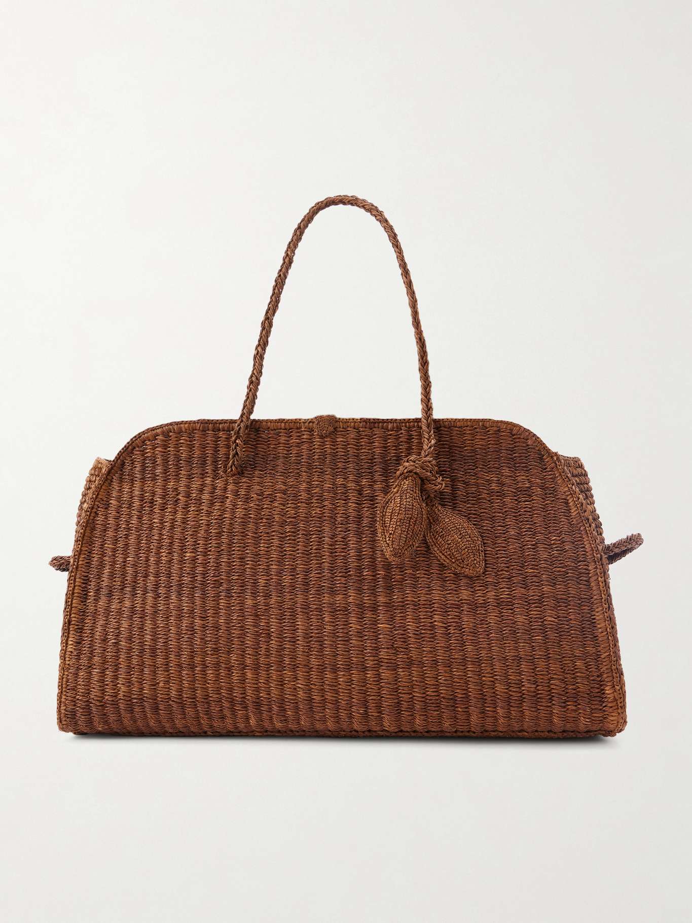 Jacquemus' 'Grand Turismo' tote bag is crafted from twisted, braided raffia in a slightly rounded shape. Two tubular handles are knotted into the body, while a magnetic closure and large internal patch pocket keep contents organised.