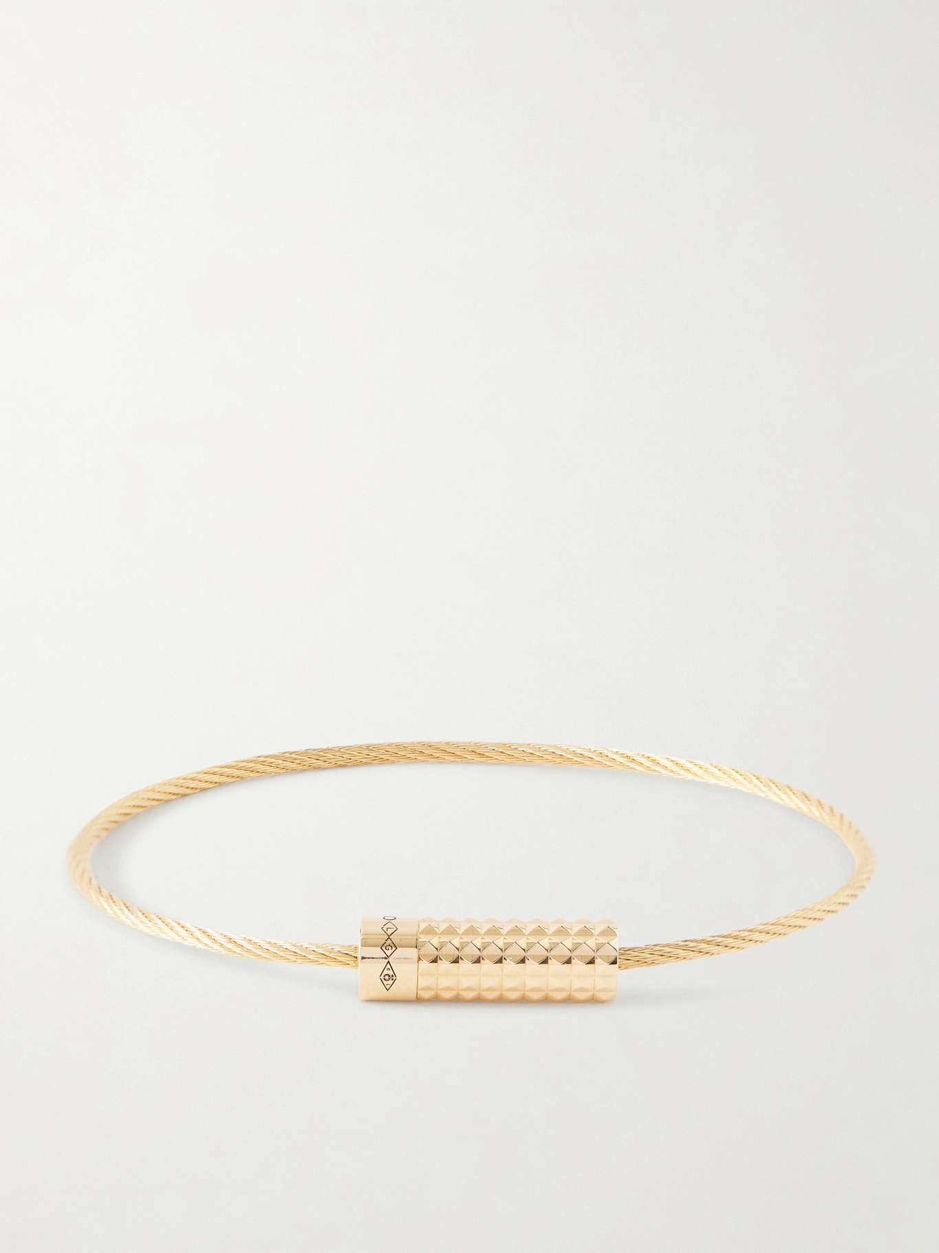 The pyramidal guilloche form of Le Gramme's bracelet takes inspiration from industrial design, while the ultra-durable cable is informed by the sturdy resilience of cable-stayed architectural bridges. It's been handcrafted at the label's Paris workshop from 18-karat gold and etched with its weight in discreet letters.