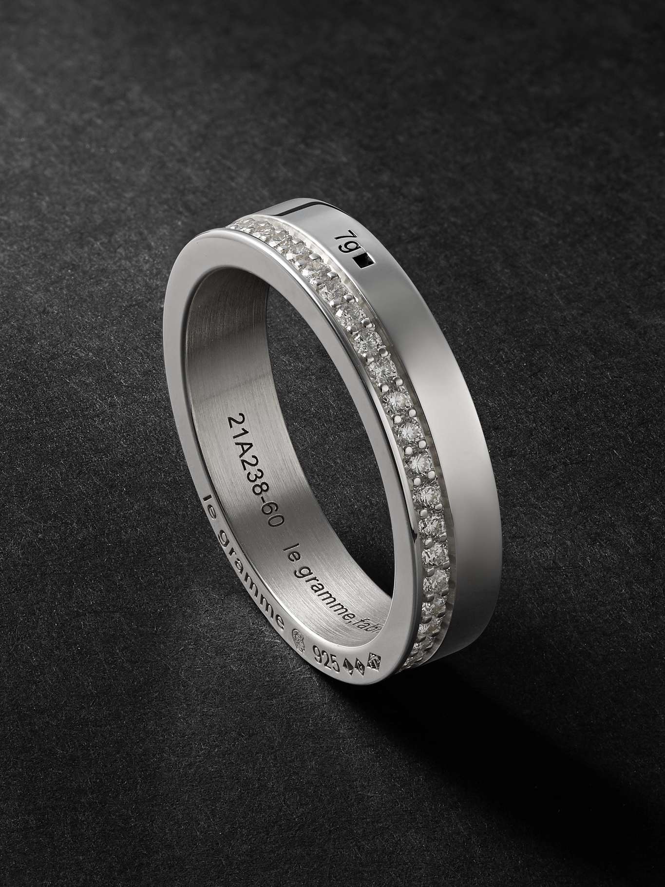 Le Gramme's pieces are all named for their weight in grams – you can spot the '7g' tag on the exterior of this ring. It's cast from polished sterling silver a medium-width band. A single row of diamonds traces the base.