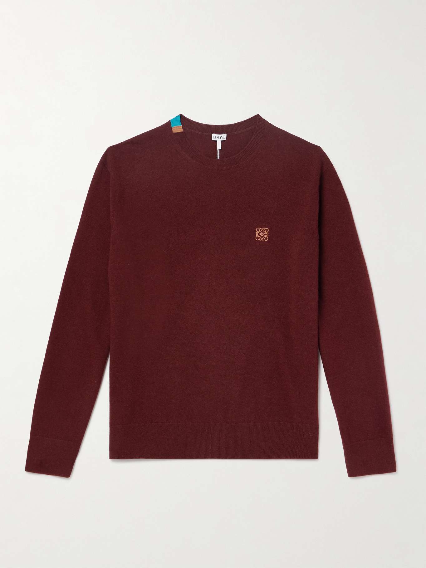 It wouldn't be a Loewe design without a pop of artful color — this sweater has teal and orange at the ribbed crew neck. It's knitted from burgundy wool-blend and embroidered with the longstanding 'Anagram'.